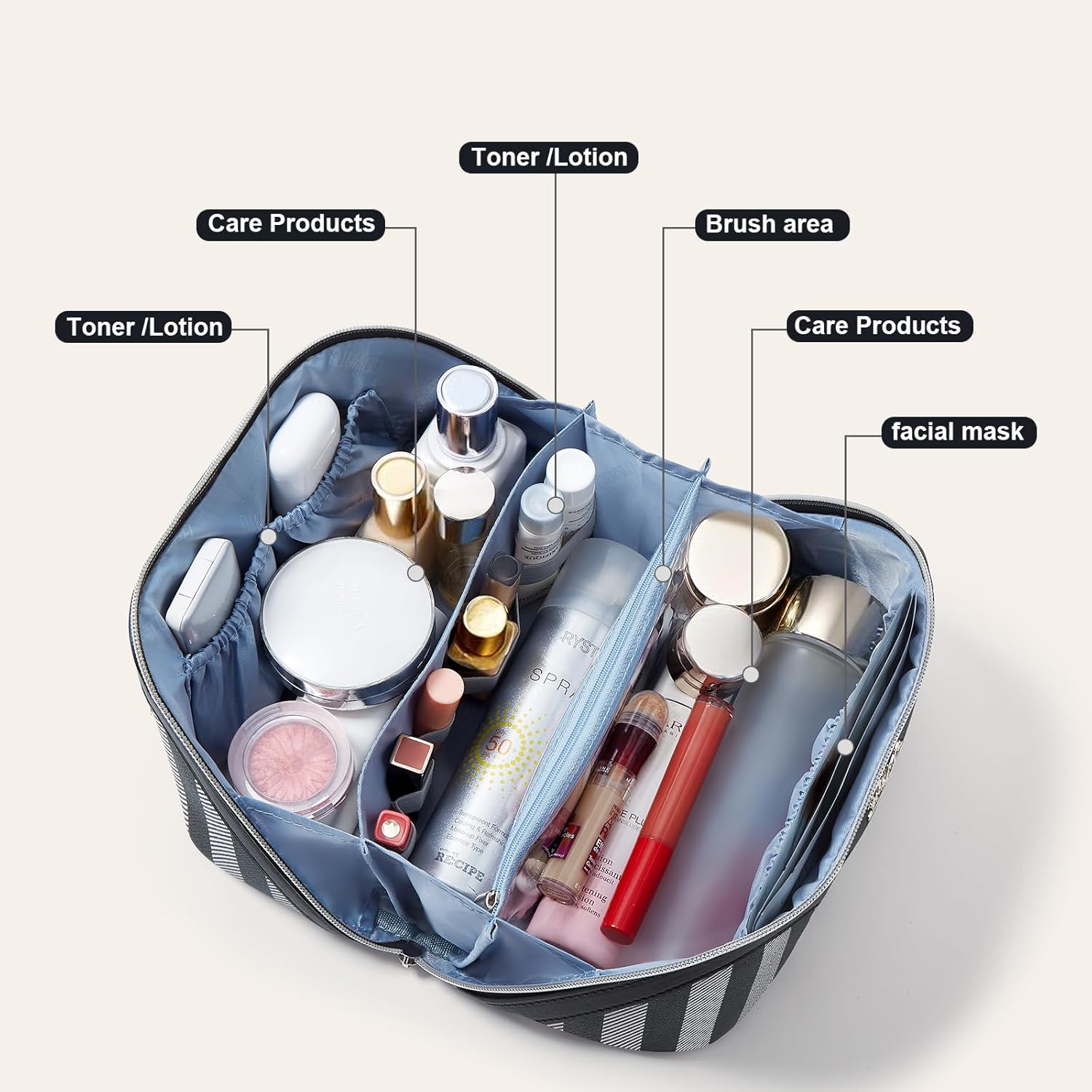 • Multifunctional Travel Makeup Bag with Compartments: This leather waterproof cosmetic bag is perfect for any setting - whether on your dresser, in the bathroom, outdoors, in the car, on the train, or packed in your luggage. It keeps your makeup organized and easily accessible, so you can meet your beauty needs anytime, anywhere.