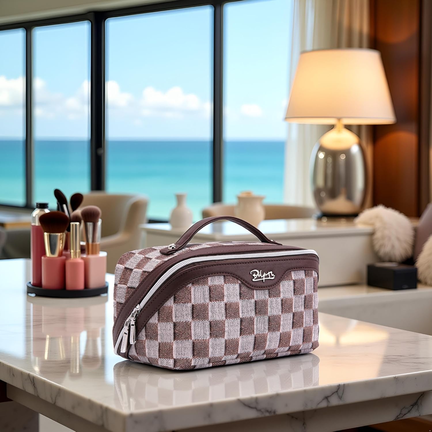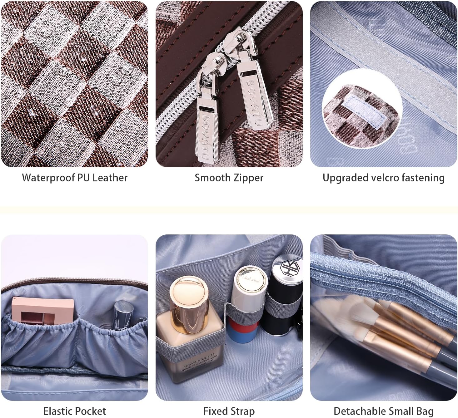• Vegan Leather Cosmetic Bags: Crafted from high-quality PU leather, these makeup bags offer a luxurious feel and texture. The durable material is both waterproof and easy to clean, ensuring your bags remain in pristine condition over time. The elegant checkered design adds a touch of sophistication to your beauty routine.