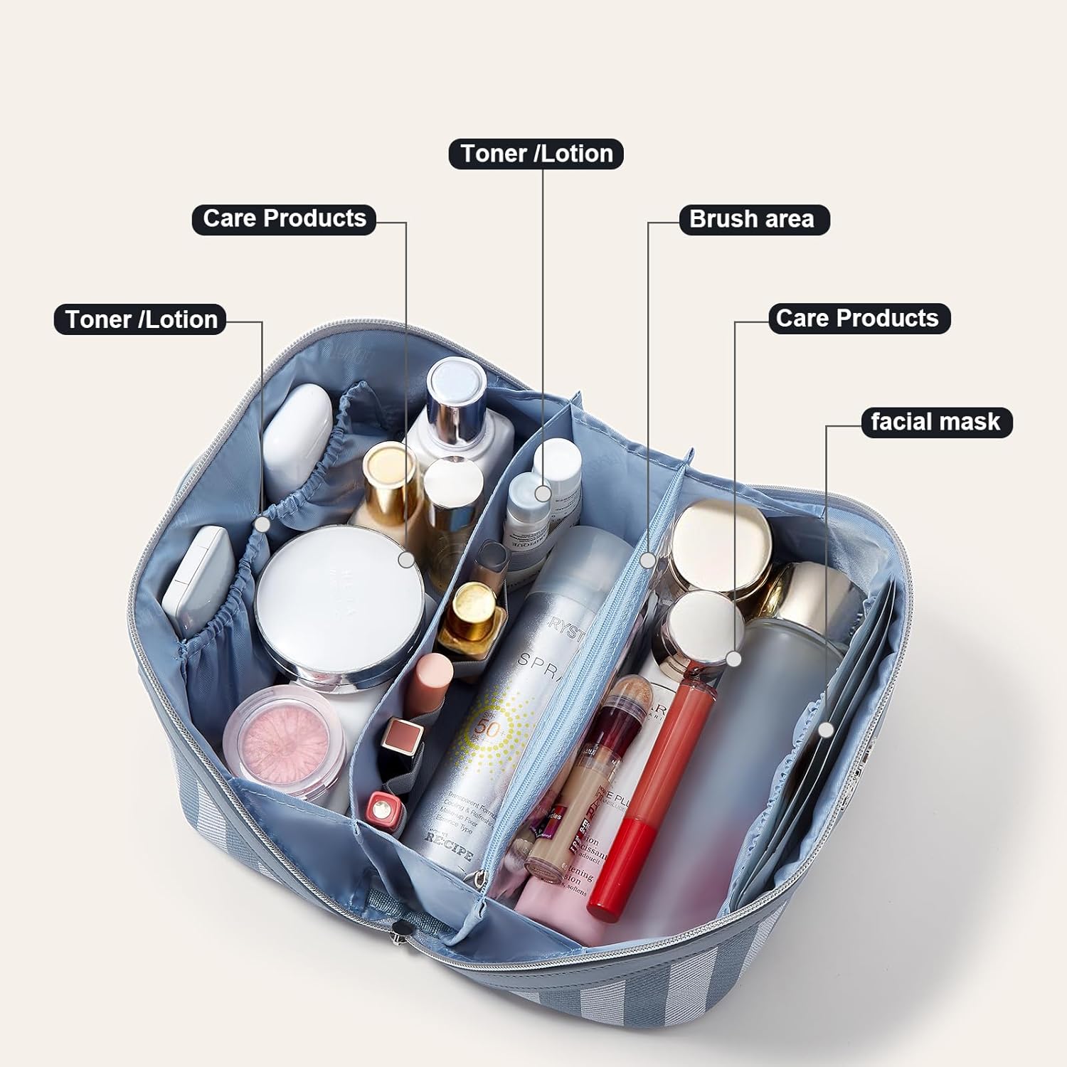 • Multifunctional Travel Makeup Bag with Compartments: This leather waterproof cosmetic bag is perfect for any setting - whether on your dresser, in the bathroom, outdoors, in the car, on the train, or packed in your luggage. It keeps your makeup organized and easily accessible, so you can meet your beauty needs anytime, anywhere.