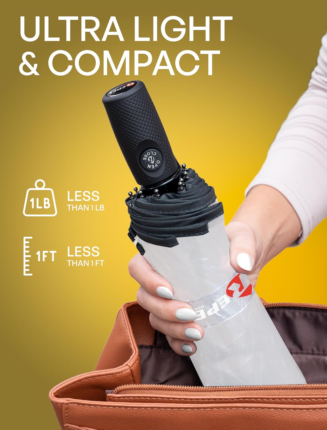 • AUTOMATIC OPEN AND CLOSE FEATURE: With one-touch push button control, this collapsible umbrella easily opens and closes instantly with little force. Repel deploys out fast and folds away in seconds, fitting into purses, backpacks, even your car or truck door. Its ergonomic handle provides comfort and a secure grip, while the quick-dry full canopy keeps you ready for work commutes or fun trips.