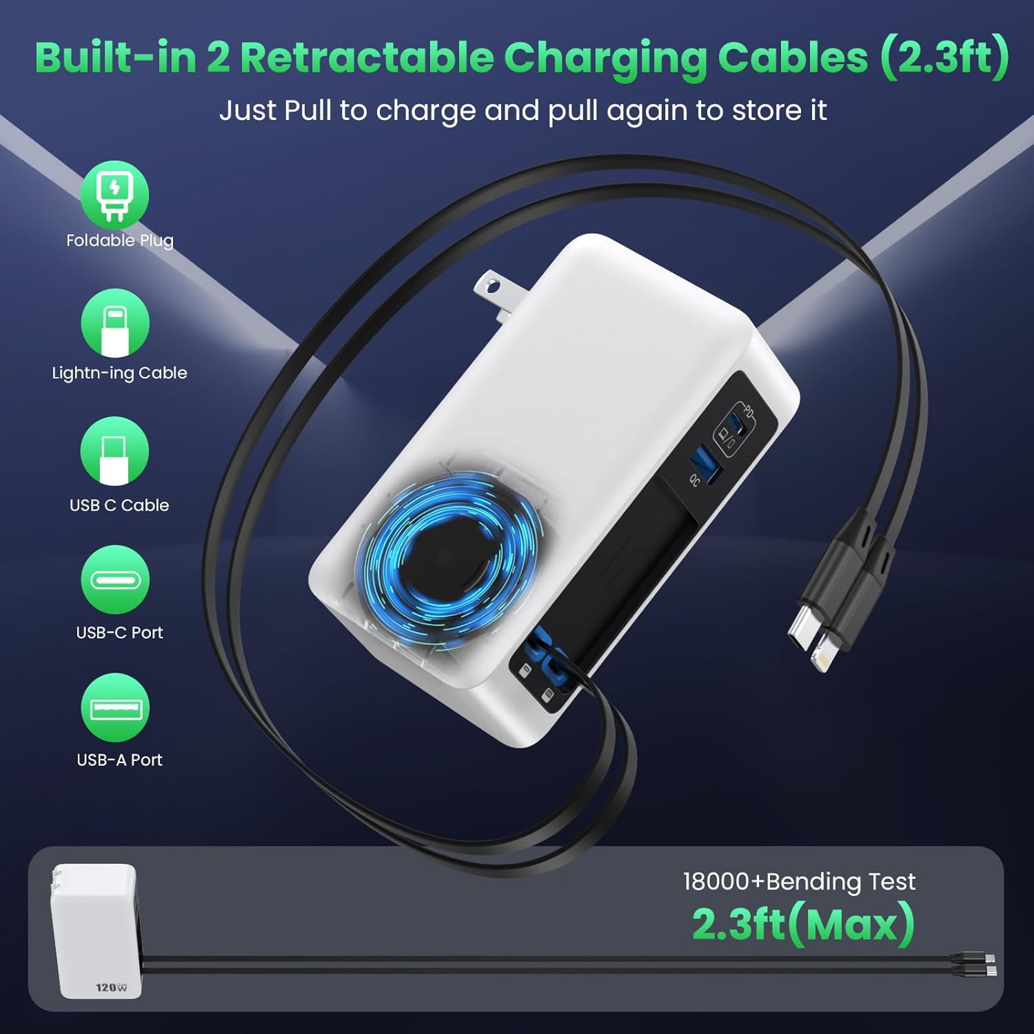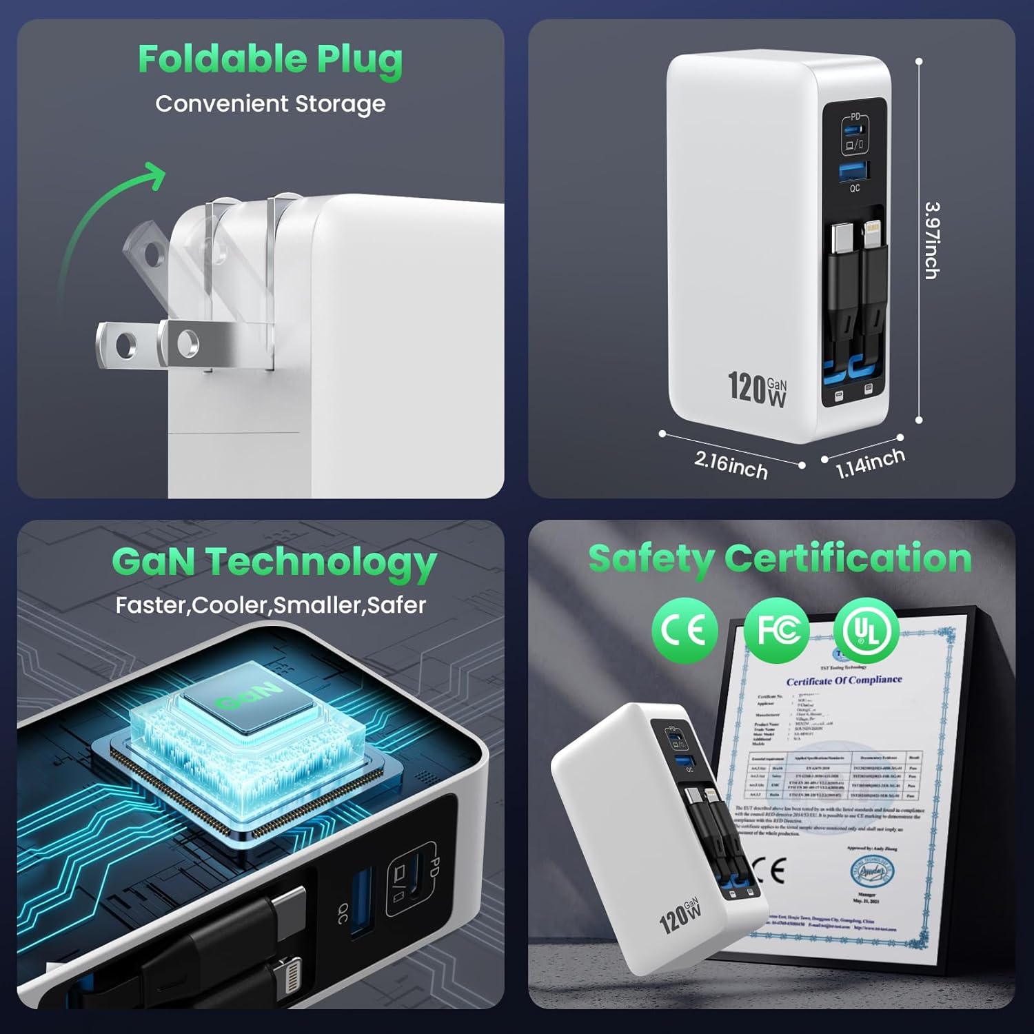 • Special Feature : 120W USB C Charger Block with 2 Built-in Retractable Cables,4-in-1 GaN IV Foldable Plug Wall Charger Fast Charging Station,PD 65W Laptop Adapter for Macbook/iPad,iPhone 16/15/14,Galaxy S24,Android etc 120W USB C Charger Block with 2 Built-in Retractable Cables,4-in-1 GaN IV Foldable Plug Wall Charger Fast Charging Station,PD 65W Laptop Adapter for Macbook/iPad,iPhone 16/15/14,Galaxy S24,Android etc