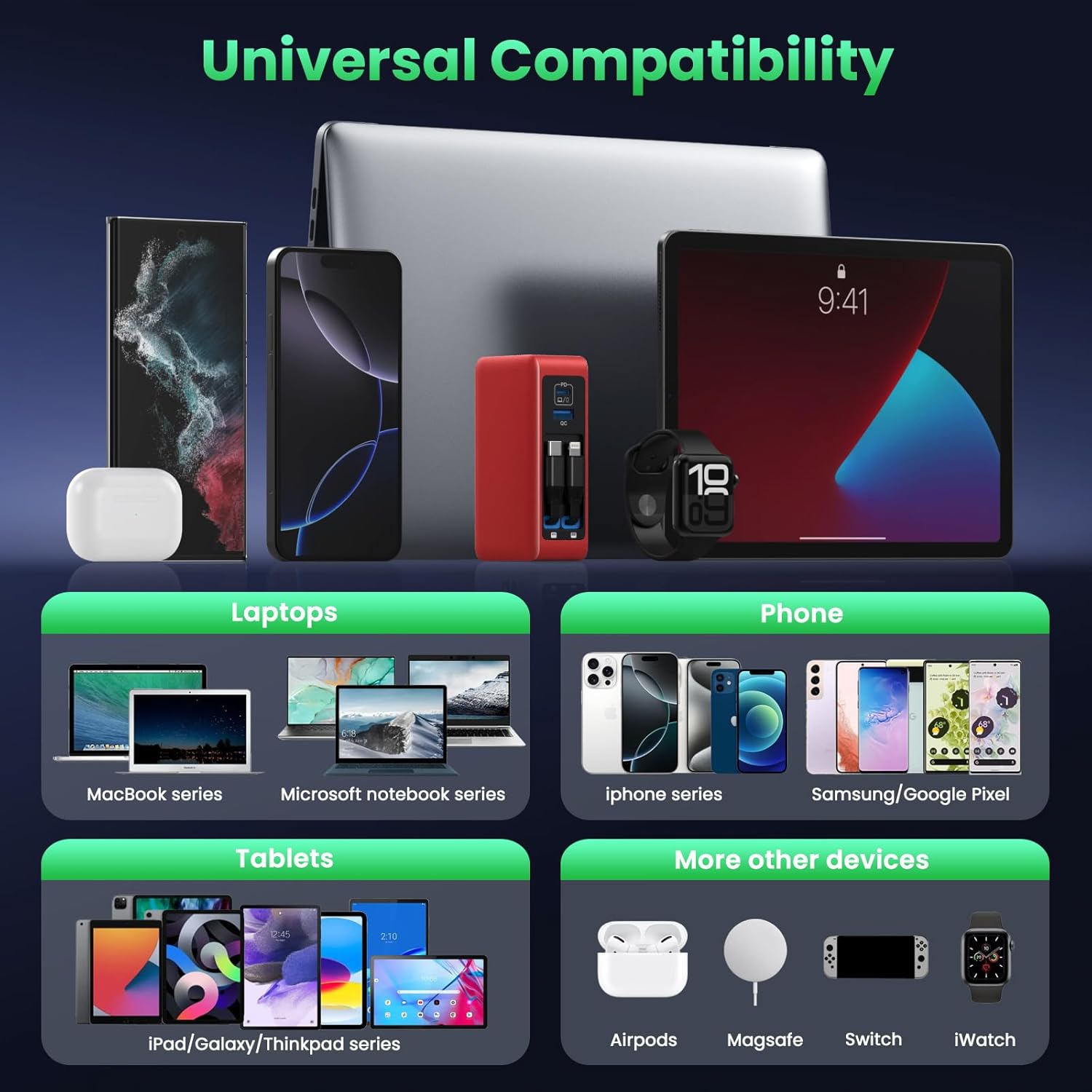 • 【All-in-One Design with 2 Built-in Retractable Cables】Eliminate messy cords! The mini retractable cable tucks neatly into the charger and features a fold-able plug and compact design, making it easy to carry and store—perfect for maintaining a clutter-free desk and for travel.