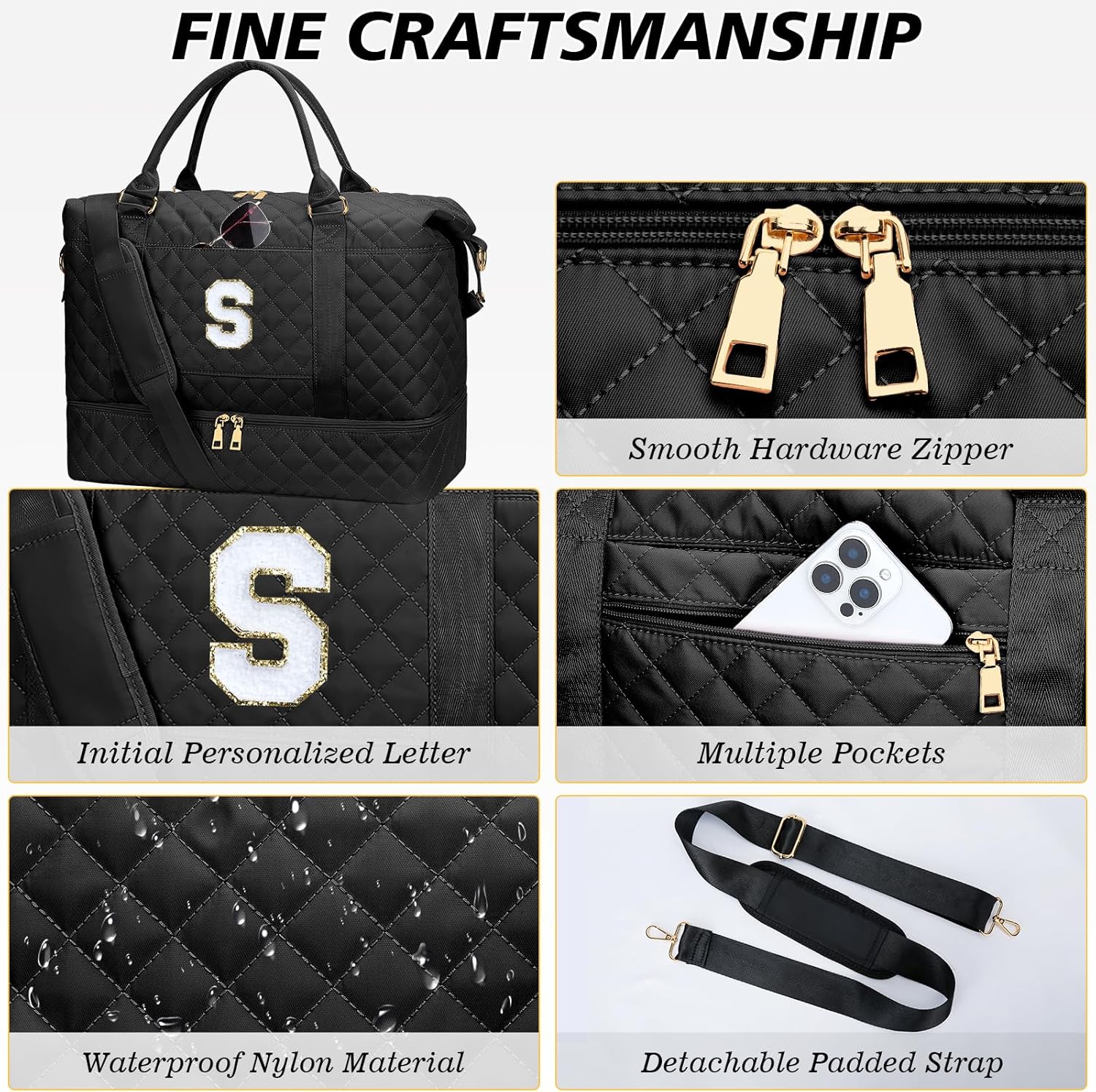 Gifts for Teen Girls Women Initial Travel Duffle Bag Quilted Weekender Carry-On Overnight with Cosmetic Bag, Gym Bag with Shoe Compartment, Black S