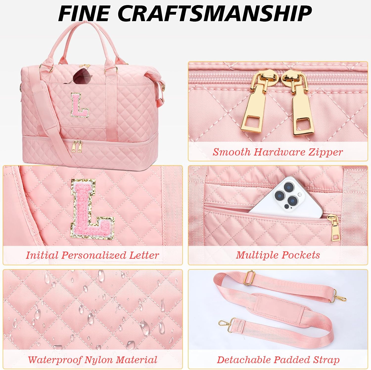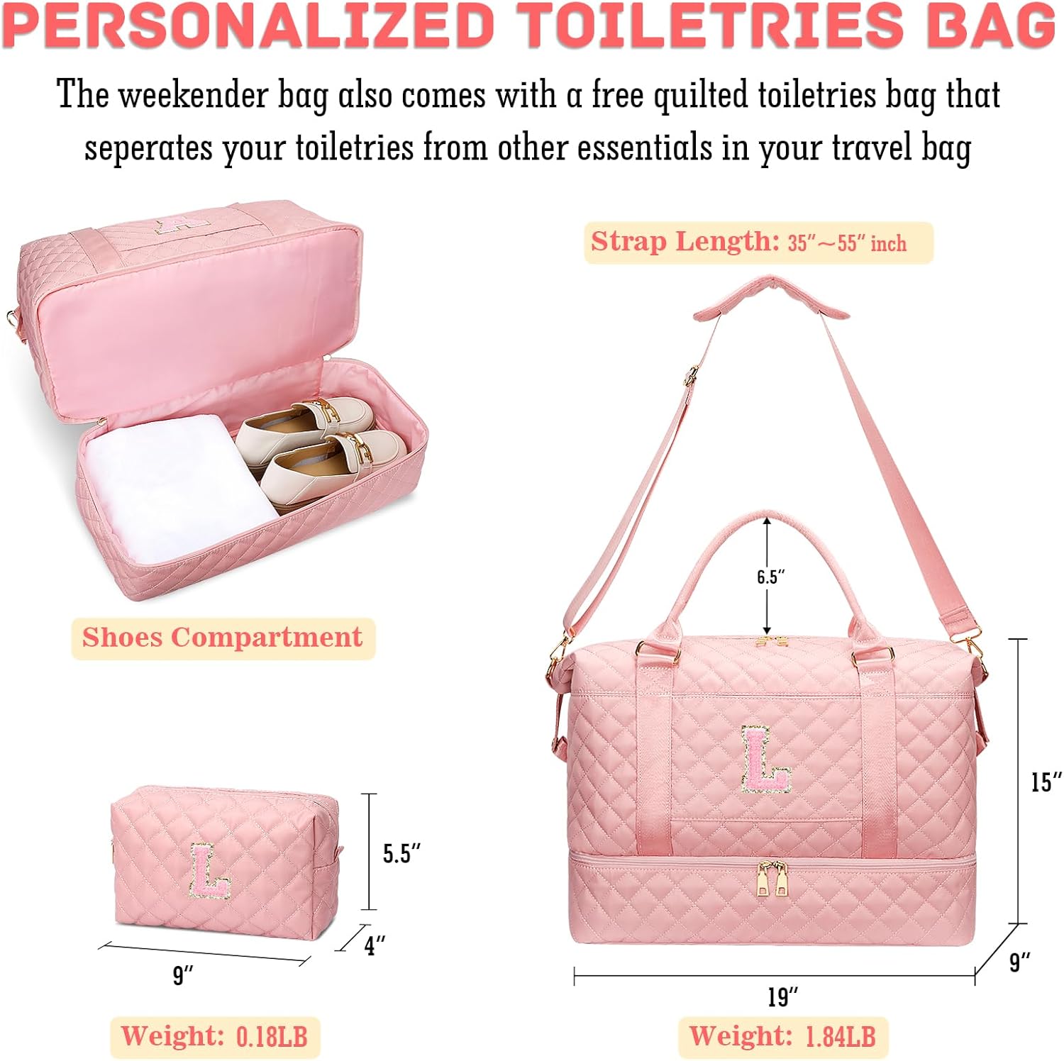Gifts for Women Girls Initial Travel Duffle Bag Quilted Weekender Carry-On Overnight with Cosmetic Bag, Gym Bag with Shoe Compartment Hospital Bag for Labor Delivery, Pink L