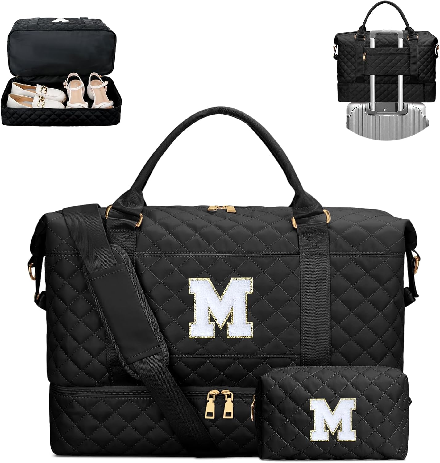 Gifts for Teens Girls Women Initial Travel Duffle Bag Quilted Weekender Carry-On Overnight with Cosmetic Bag, Gym Bag with Shoe Compartment, Black M