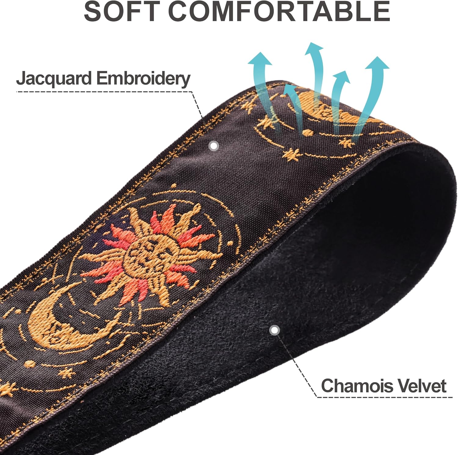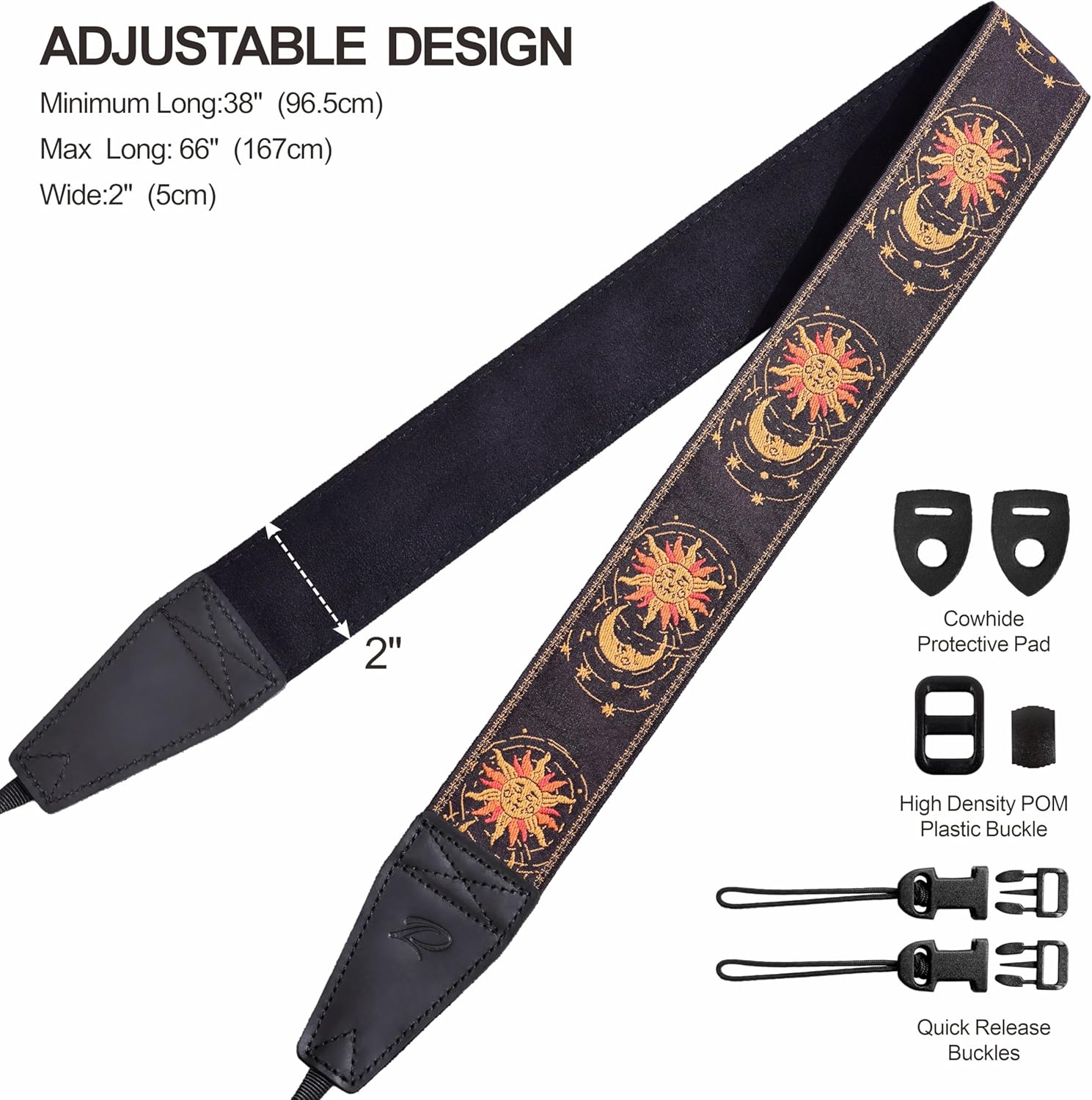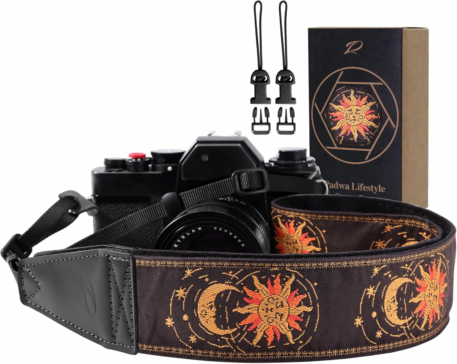 Padwa Lifestyle Helios Moon God Camera Strap -2" Full Grain Leather Ends Camera Straps for Photographers, Vintage Embroidered Cotton Weave Soft Suede Fabric Padded Strap Quick Release fits All Cameras