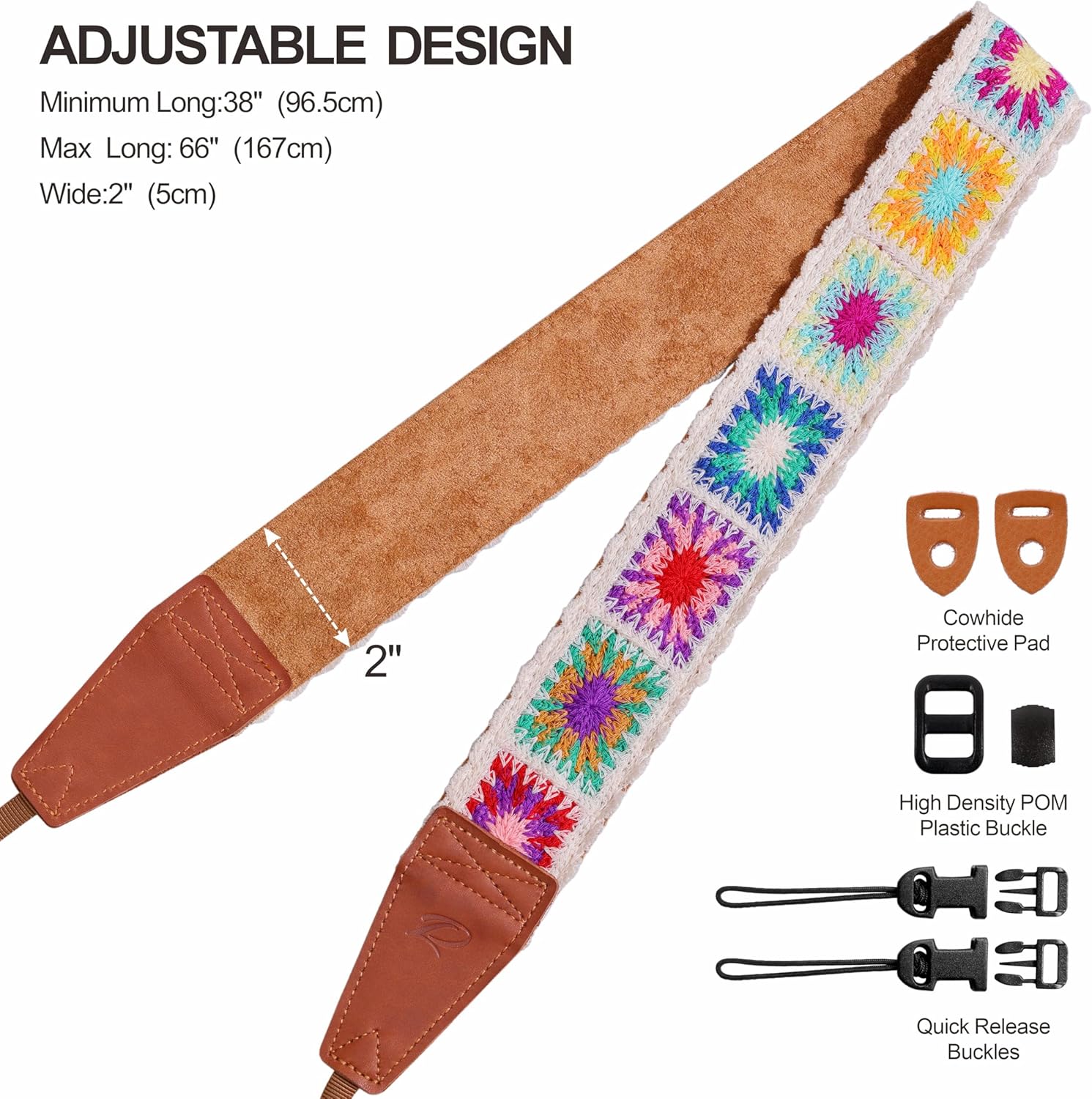 • 📷WIDE AND COMFORTABLE : The camera strap is made of high quality cotton, retro embroidery process , 2” (5 cm) ultra-wide cotton strap design , more breathable , Wear around your neck , cross body, or over one shoulder ! The wide , comfortable cotton strap with Soft Suede Fabric Padded will Relieve the pressure on your shoulders and neck when using the camera for extended periods of time,making you more comfortable to use.