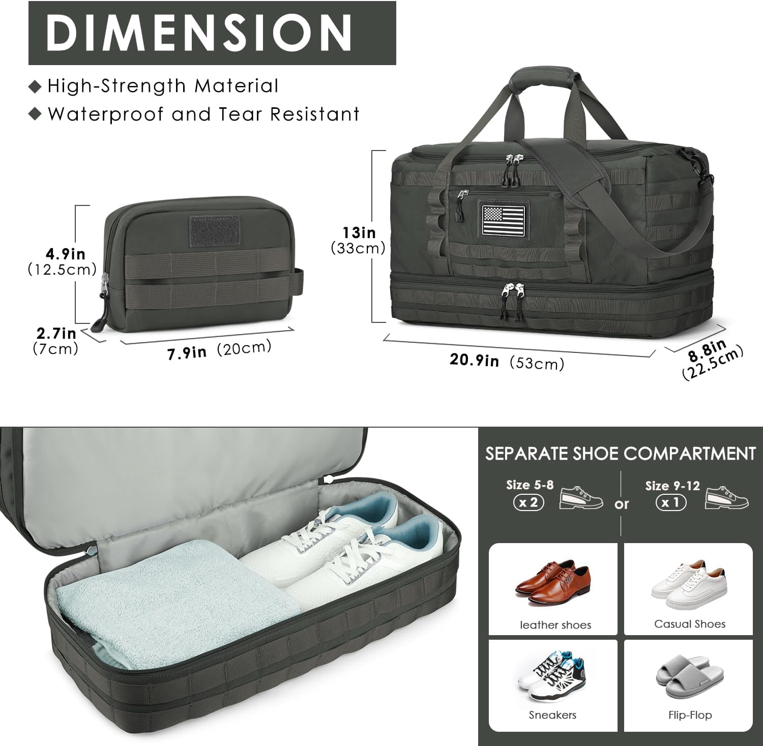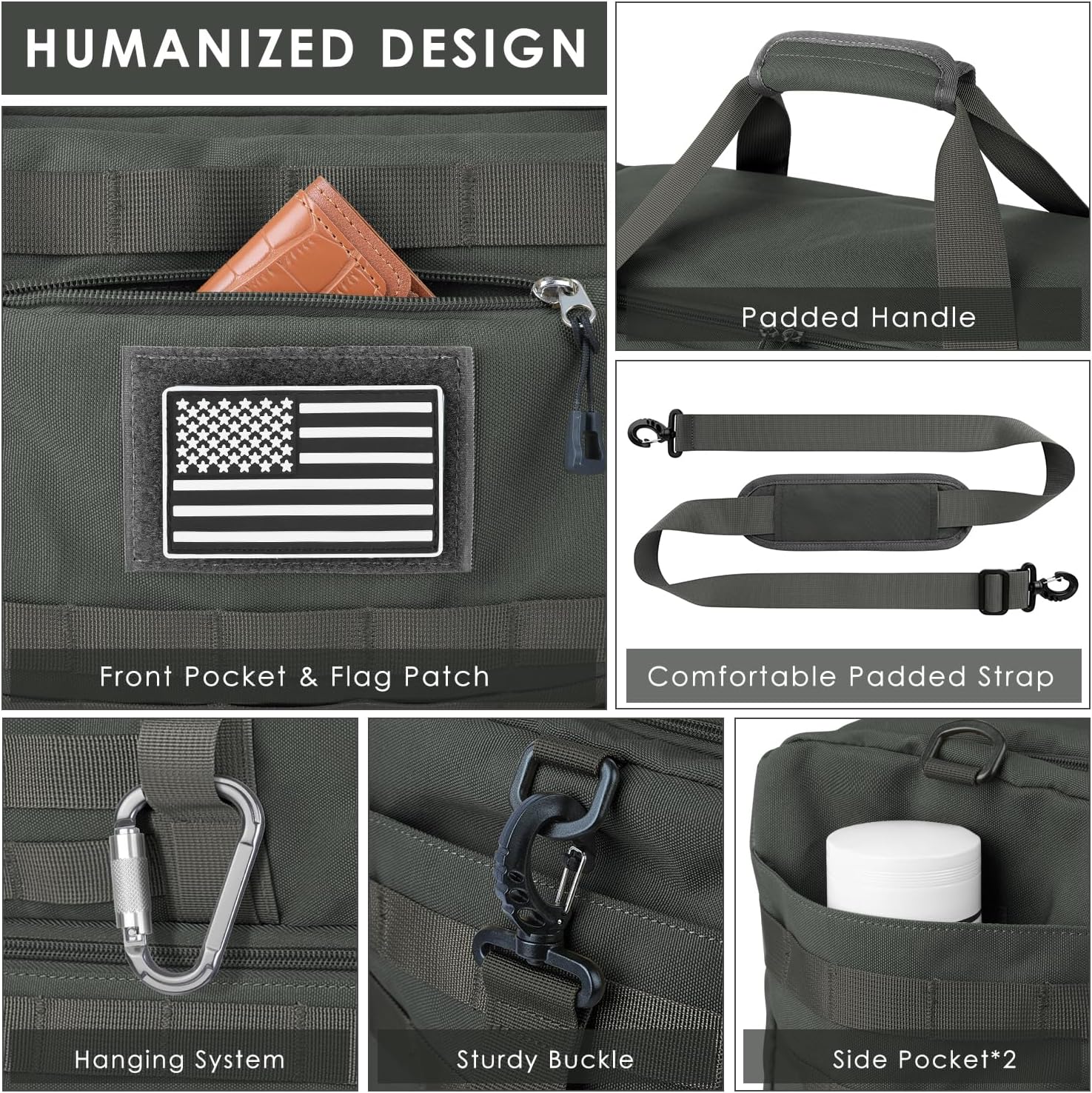 • Tactical Duffle Bag's MOLLE System: Military bag is designed with patch panels on the front and sides for attaching name patches and morale patches. The MOLLE webbing of the tactical bag can be used to attach extra gear you need. The military look duffle bag for men meets the greatest demands of outdoor explorers, military enthusiasts and fashion trendsetters for travel bags