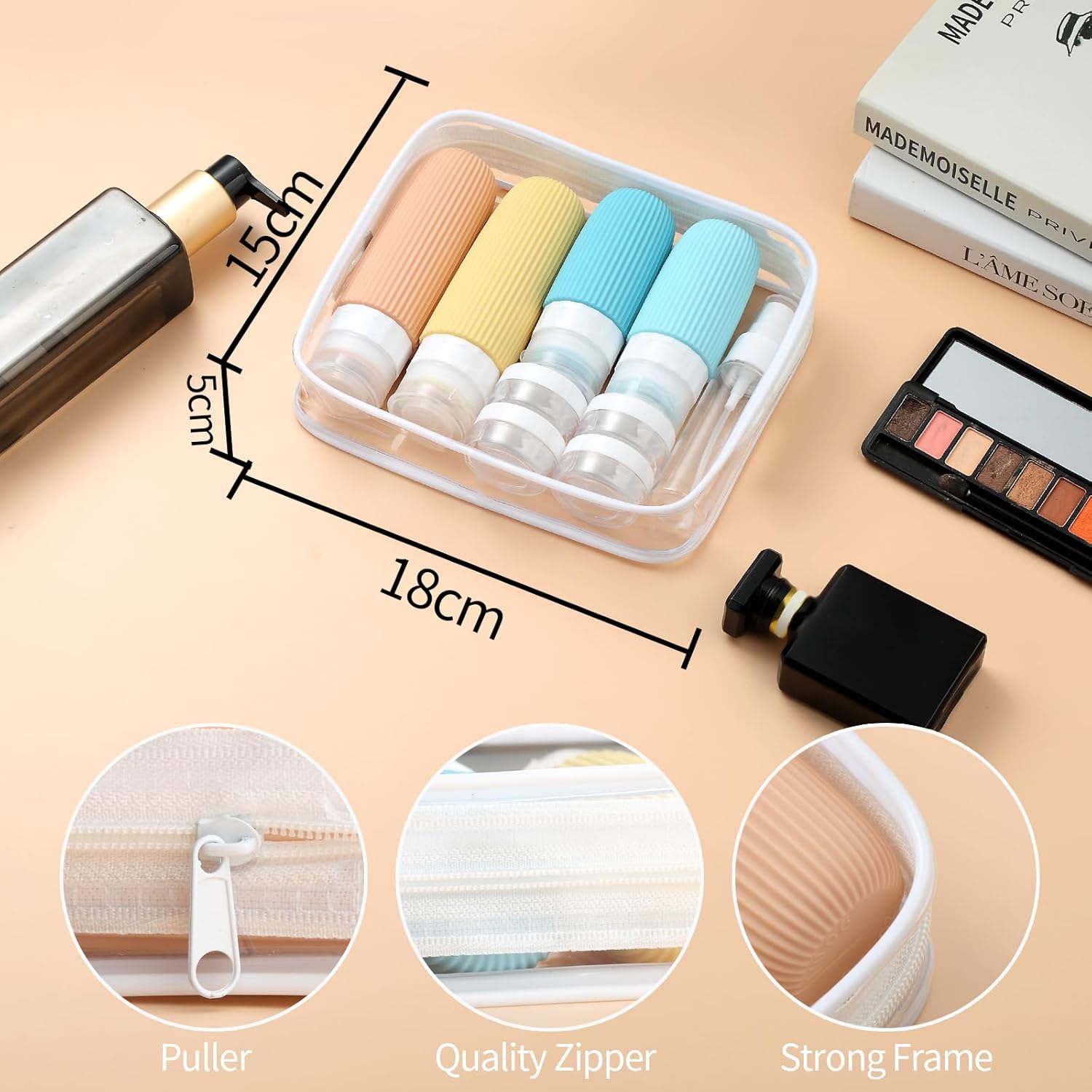 • Useful Travel Accessories: This is a nice assortment of travel containers in a useful zip case. ( Come in 4 Travel Bottles+4 Travel Jars+2 Spray Bottles+2 Scoopers+1 Funnel+1 Clean Brush + 1 Page Label + 1 Clear Toiletry Bag ) Multiple ones allow you take along different beauty products and toiletries according to your requirement