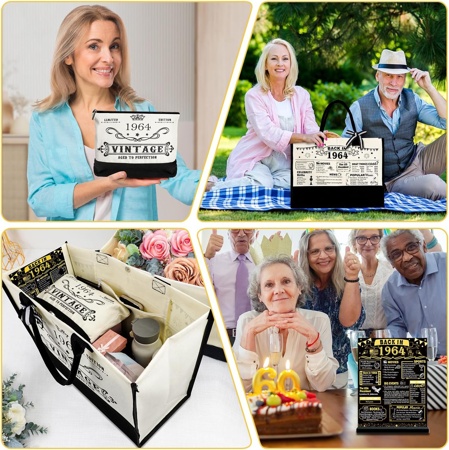 YeohJoy 61st Birthday Gifts for Her Canvas Tote Bag Travel Gear, Unique 61 Years Old Birthday Gifts for Girlfriend Sister Friends Women, Vintage 1964 Handbag & Cosmetic Bag & Back in 1964 Poster