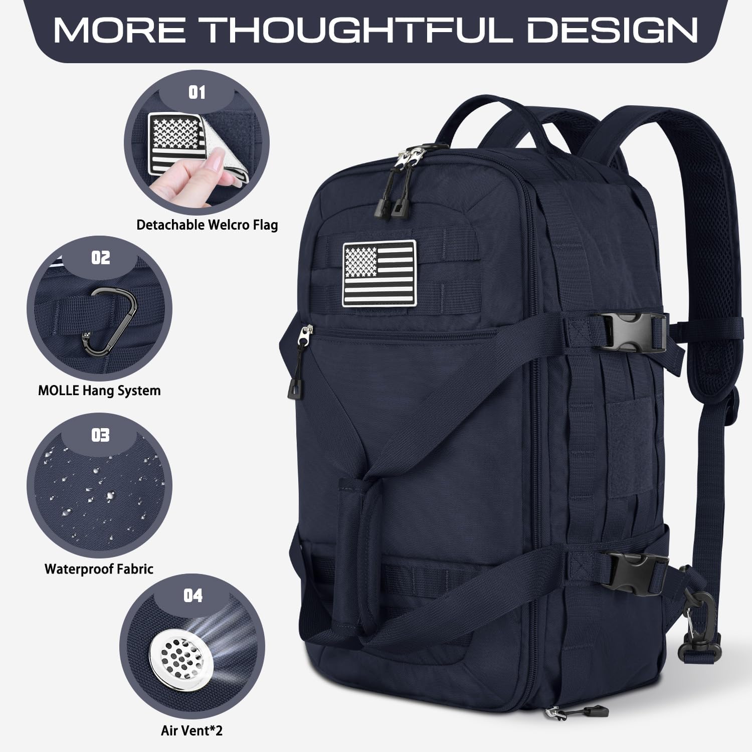 • For Tactical Gear: The tactical bag is made of waterproof and tear resistant 600D nylon, suitable for various outdoor environments. The design of the MOLLE suspension system makes this tactical backpack special. The front and side panels with a large number of Molle webbing, designed to be used in combination with other equipment, such as universal buckle, kettle pouch, walkie-talkie pouch etc. The Velcro designs for personalized customization(1 additional flag patch)