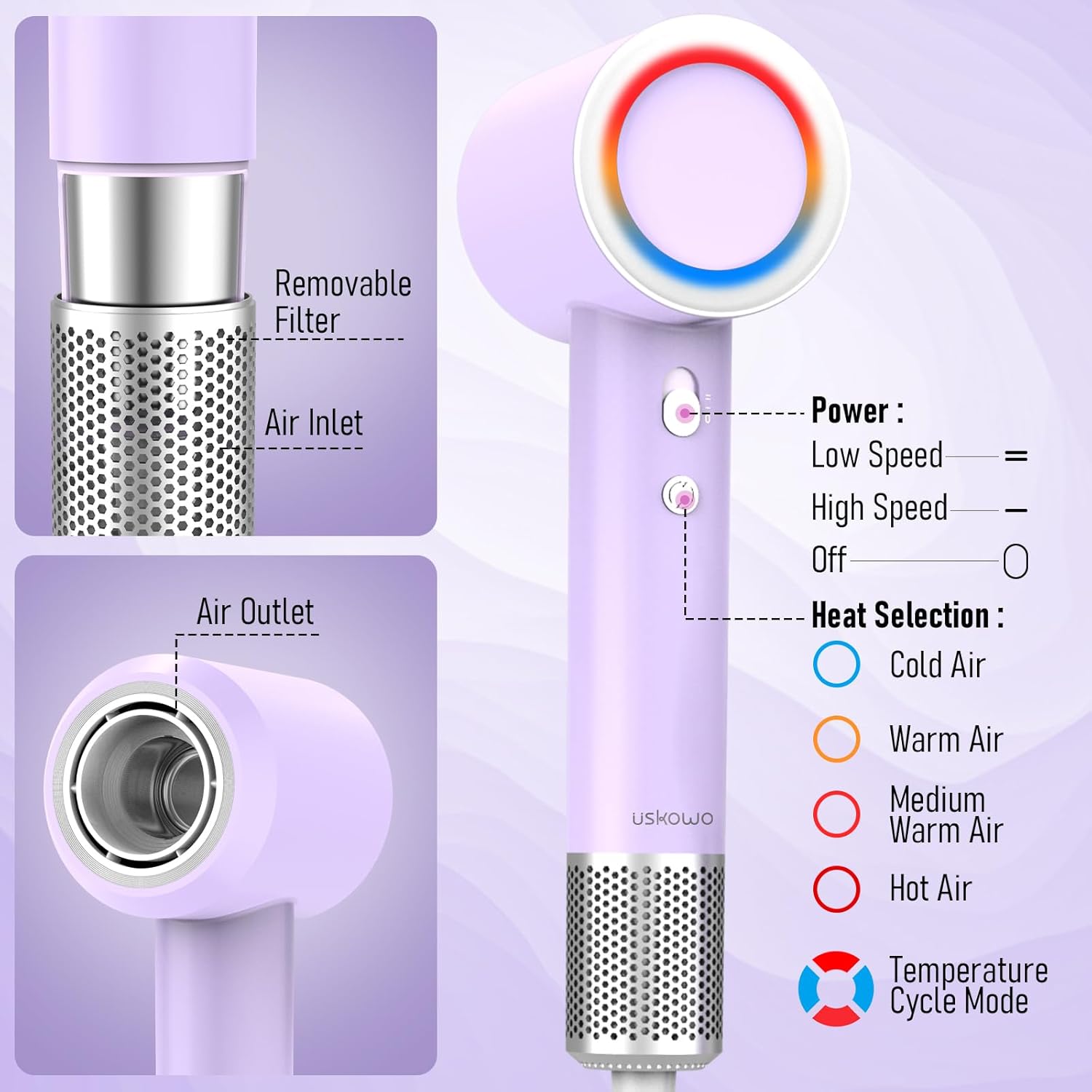 • 【1800 Watt High Speed Brushless Motor】USKOWO hair dryer is equipped with a 160, 000 rpm high-speed brushless motor.which can instantly generate strong airflow to quickly dry hair. Faster drying means time-saving and less damage to your hair.