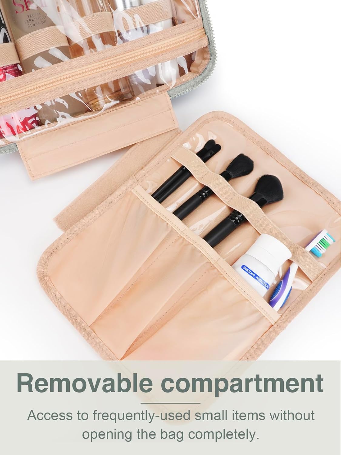 • Easy Access & Travel Friendly: Equipped with a 360° rotating metal hook, it offers multiple hanging options in any bathroom or closet. Transparent pockets provide a clear view of your items, no digging around. The detachable bottom pouch adds flexibility and can be used on its own. A trolley belt on the back makes hands free, no need to worry about traveling with smaller size suitcase.
