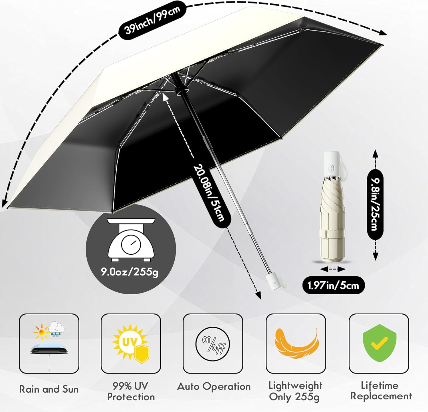 Automatic Mini Travel Windproof Folding Umbrella - UV Protection, Instant Open/Close for Rain/Sun, Small Compact Lightweight Design Fits in Tote Bag/Travel Case/Backpack for Commute, Women & Men