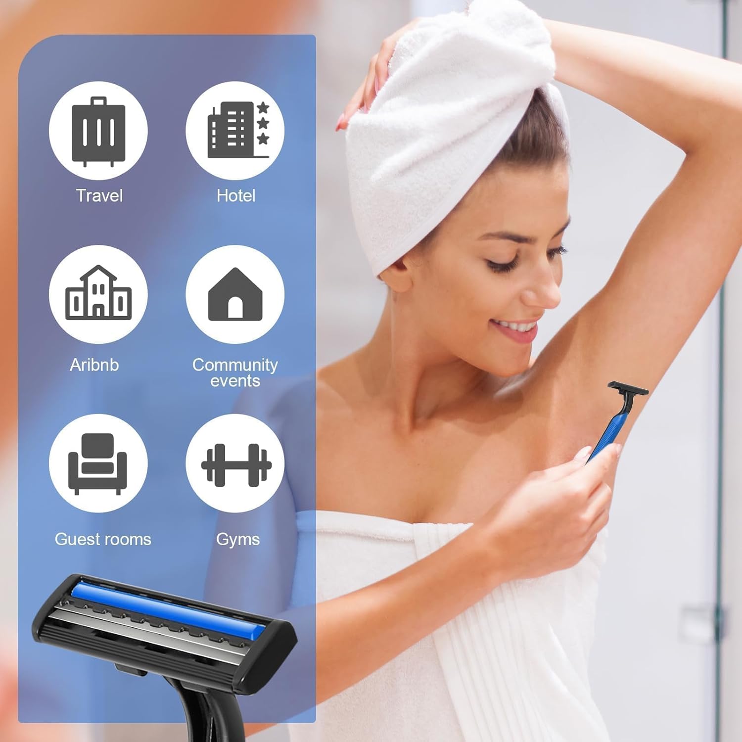 120 Pack Disposable Twin Blade Razors Individually Wrapped, Clear Safety Cap, Multipurpose Portable Shave Razor for Man Woman Bathing Hotel Travel (Blue)