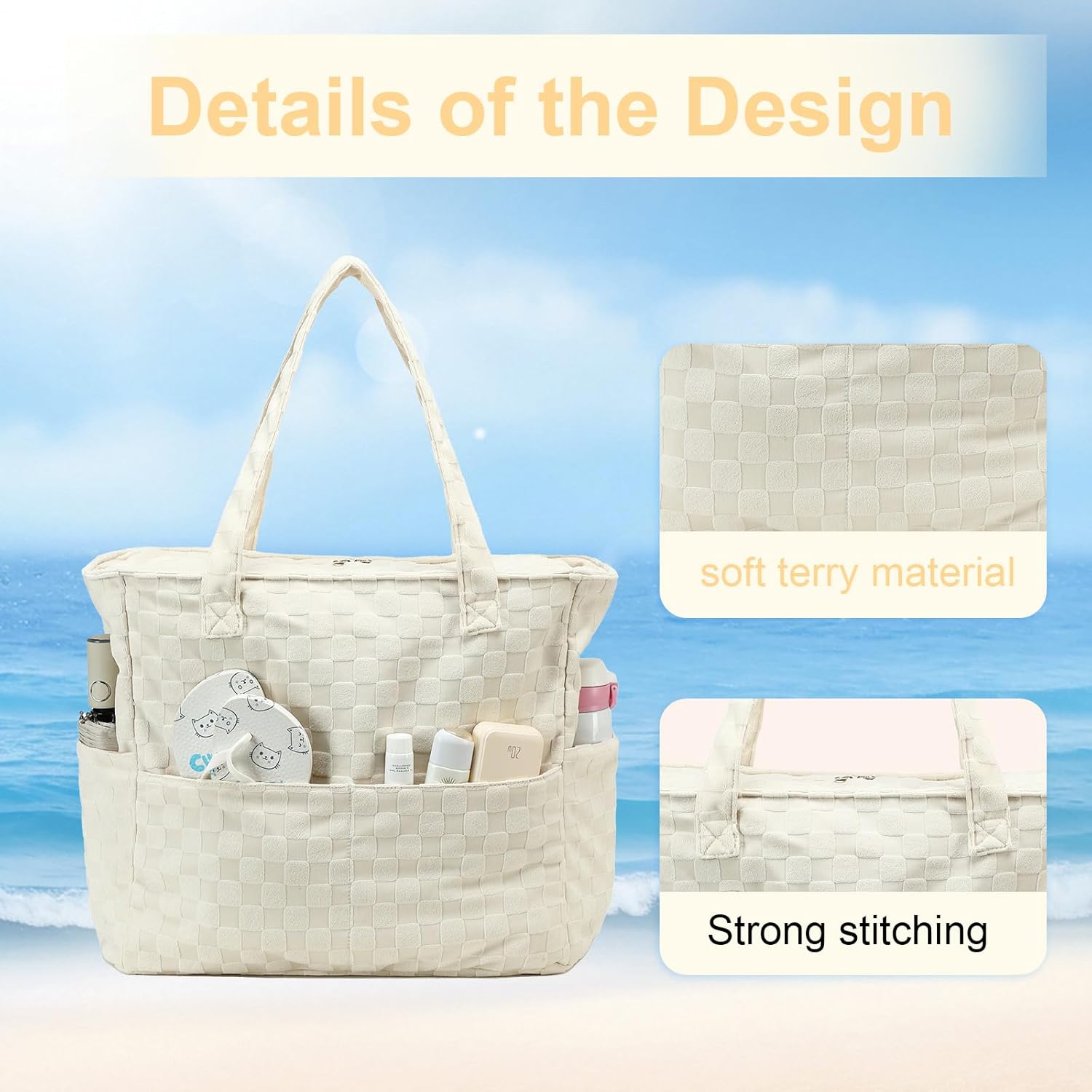 • Sandproof: This beach tote features soft terry fabric, which is sandproof, sand shakes right off instead of carrying it home with you. Care Instructions: Terry fabric stains easily and is not waterproof. Spot clean. Not recommended for machine washing.