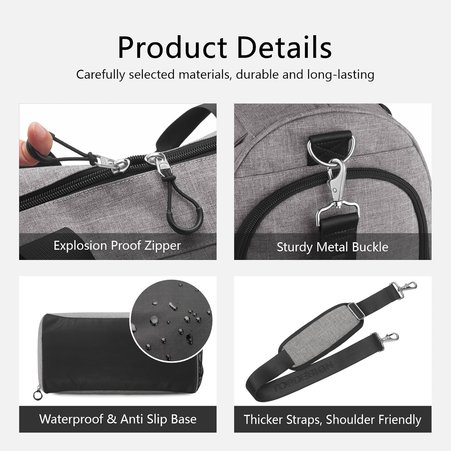 • NO MORE CHAOS: Measures 20 x 10 x 10 inches with 6 pockets, main compartment accommodates all your essentials with ease, a spacious front pocket for undergarments, and a zippered pocket to secure small items. This duffle bag features a ventilated shoe compartment on the right side to separate shoes from clean clothes. And a large waterproof PVC pocket is great for toiletries, swimsuits, and sweaty gym wear. A mesh pocket on the left holds your towels or sports water bottle.