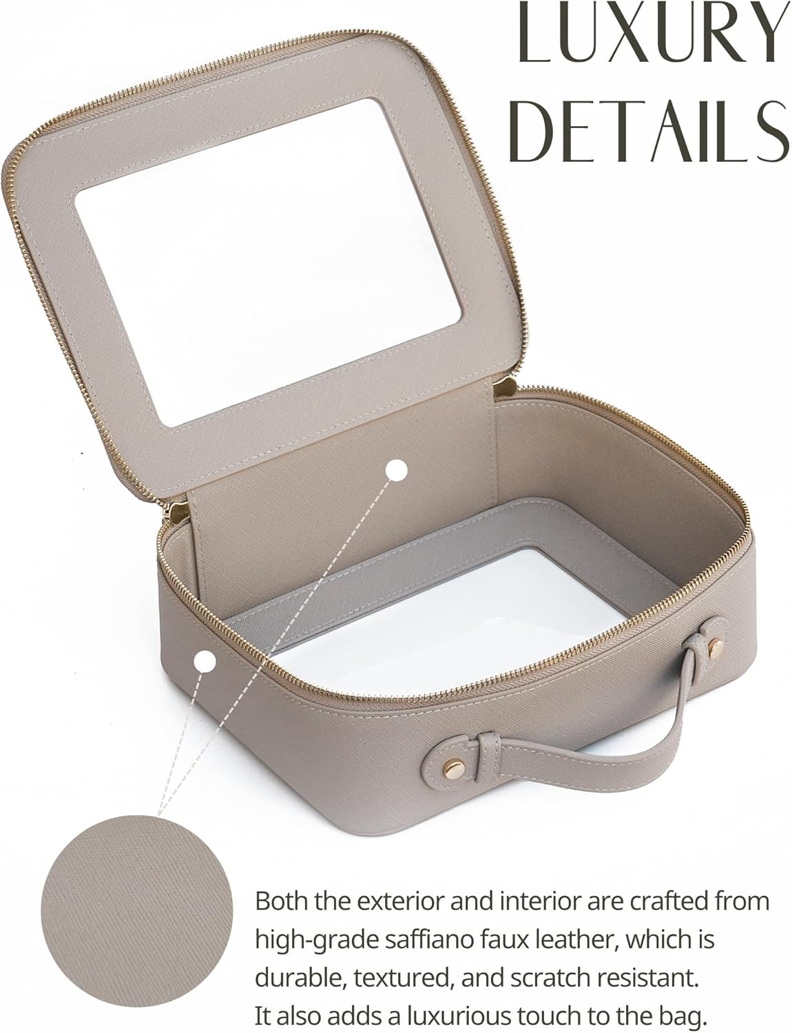 • [Premium Material and Durability] – The clear cosmetic case, both the exterior and interior, is crafted from high-grade saffiano faux leather, which is highly scratch resistant, durable and exceptionally easy to keep clean. It features a smooth zipper for secure closure, and elegant light gold metal hardware accents, adding a luxurious and sophisticated touch to the bag's overall design.