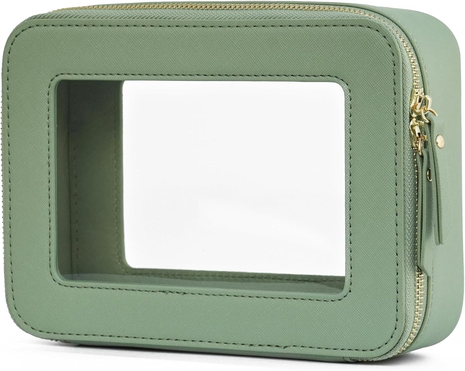 • [Premium Material and Durability] – The clear cosmetic case, both the exterior and interior, is crafted from high-grade saffiano faux leather, which is highly scratch resistant, durable and exceptionally easy to keep clean. It features a smooth zipper for secure closure, and elegant light gold metal hardware accents, adding a luxurious and sophisticated touch to the bag's overall design.