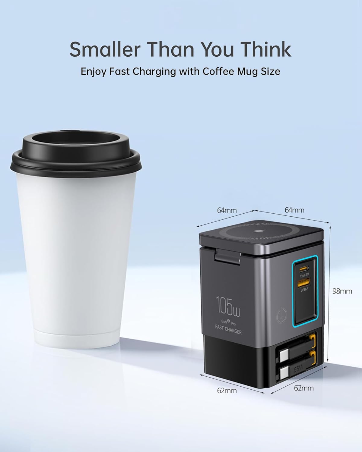 • 【Charge 6 Devices – 105W Power Hub】 All-in-one GaN charging station with 2 wireless pads (MagSafe + Qi), 2 retractable USB‑C cables (65W each), 1 USB‑C and 1 USB‑A port. Powers phones, tablets, and laptops at once while keeping your desk neat. Supports devices rated for 100W or 120W, delivering up to 105W total output.