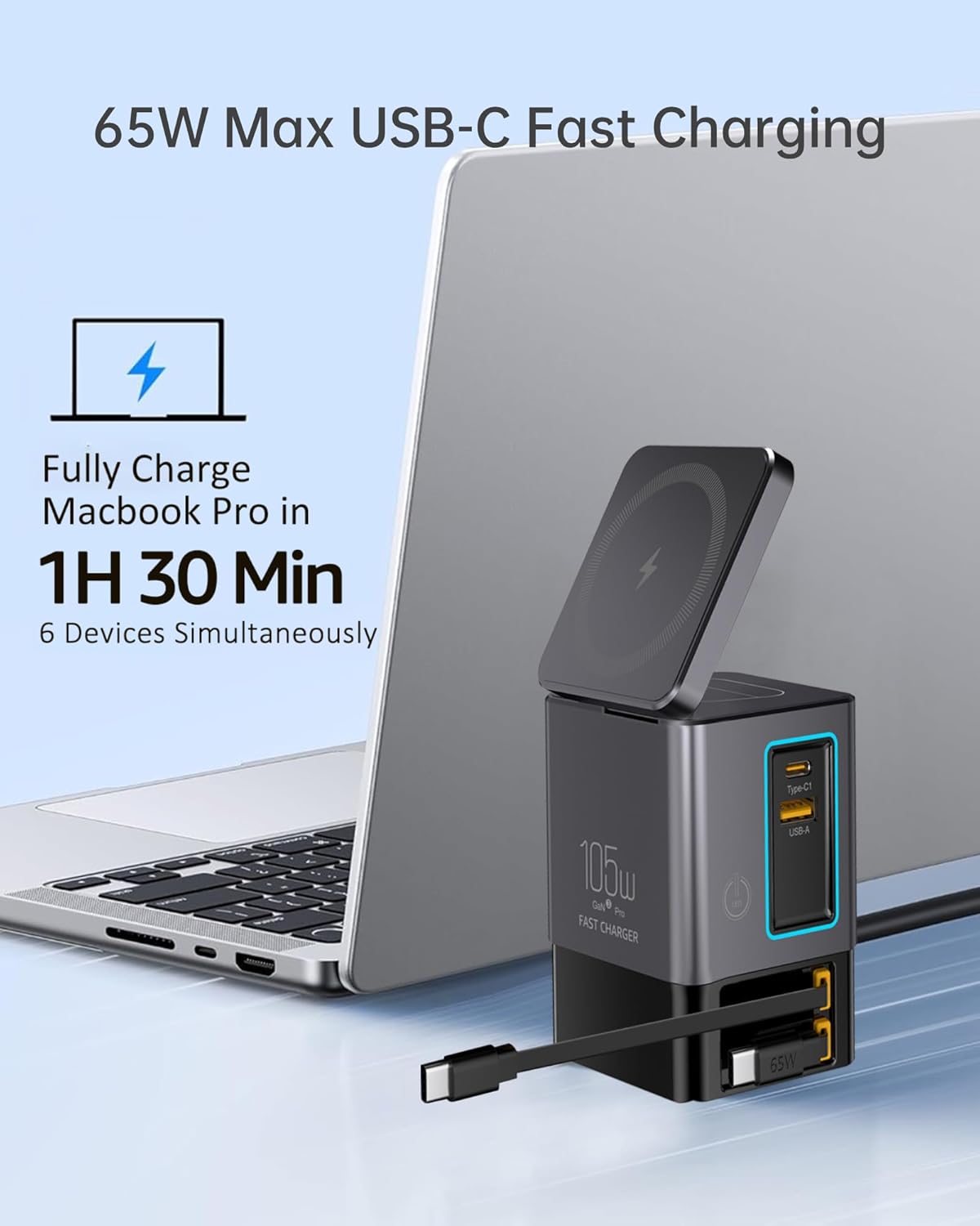 105W GaN Retractable Charger, 6-in-1 Charging Station with Magnetic Pad – MagSafe Compatible, USB-C Fast Charging for iPhone, AirPods, MacBook, Apple Watch, and Other Phones, Tablets, Laptops