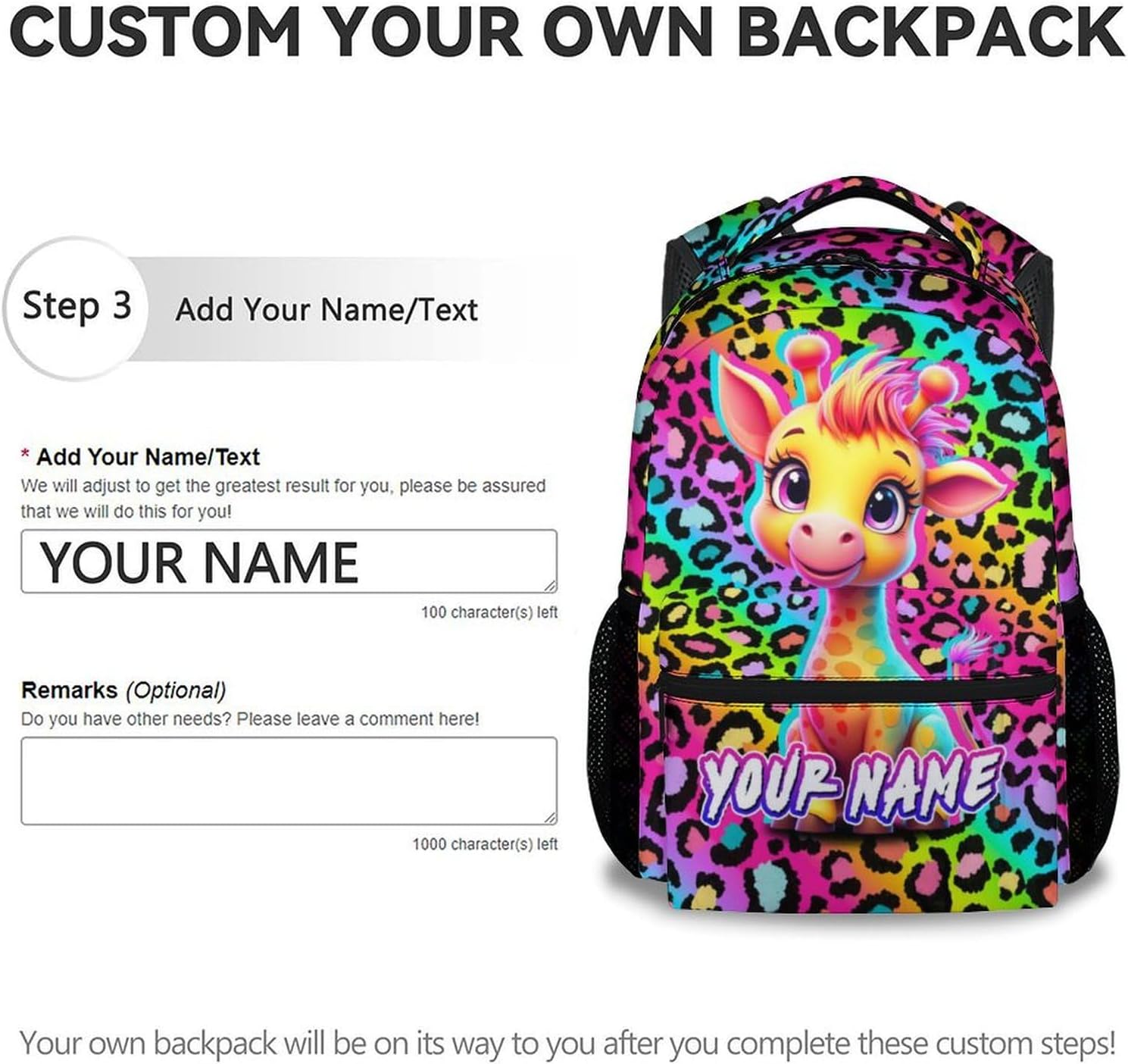 • Personalized Backpack: Click the "Customize Now" button, edit the text, and order a personalized schoolbag for yourself or your child. Design your own customized backpack, suitable for school, travel or as a thoughtful gift