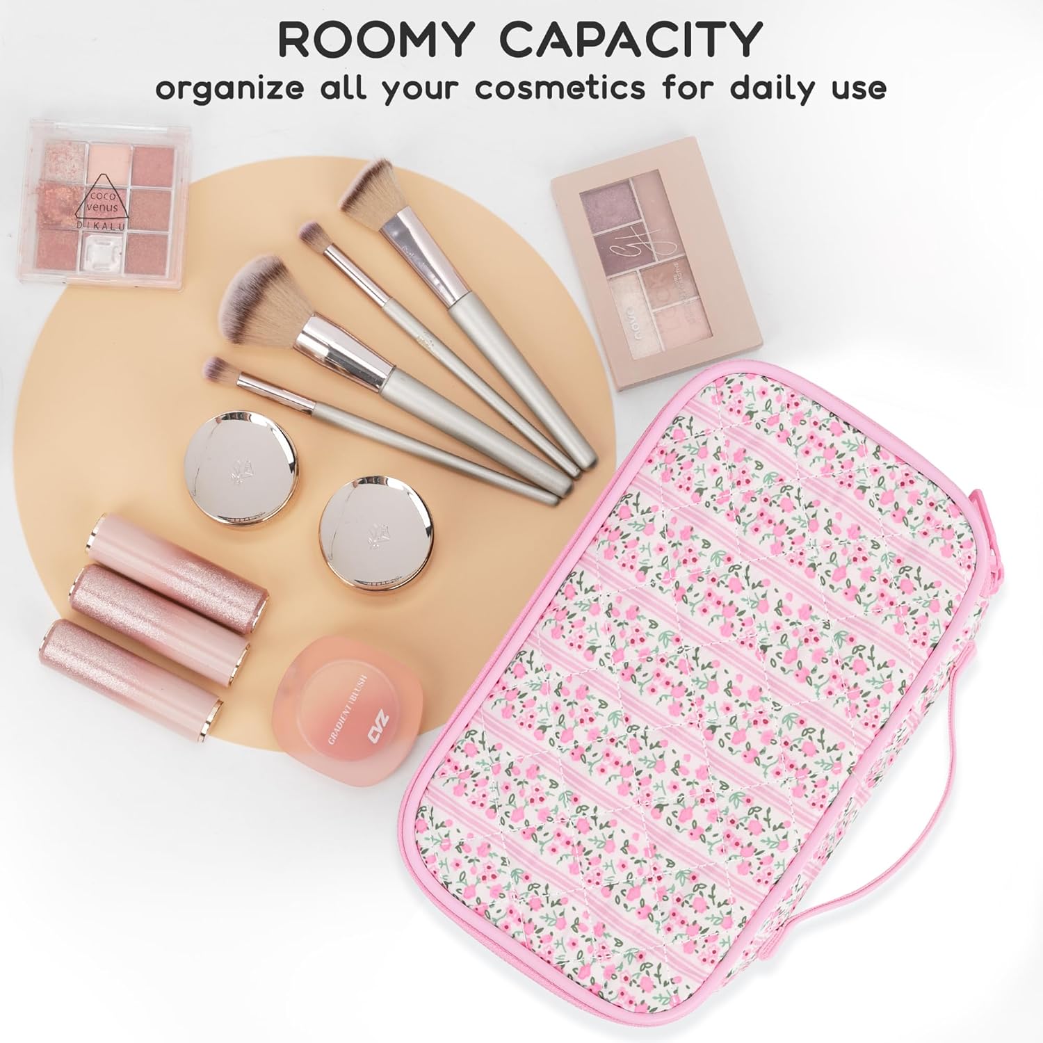 Relavel Cute Makeup Bag for Girls, Portable Pink Cosmetic Bag, Dual-layer Makeup Pouch with Brush Holder, Multi-Functional Preppy Toiletry Organizer for Travel, Daily Use - Pink Flower