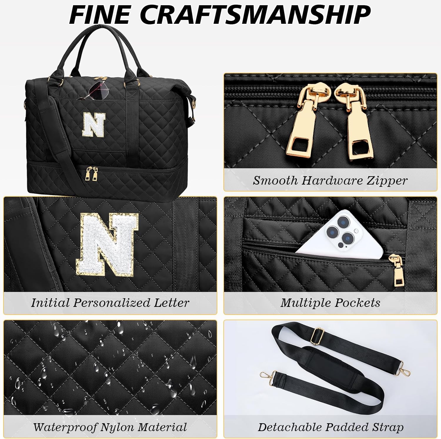 Gifts for Women Girls Christmas Initial Travel Duffle Bag Quilted Weekender Bags Carry-On Overnight with Cosmetic Bag Hospital Bag for Women Labor Delivery, Black N