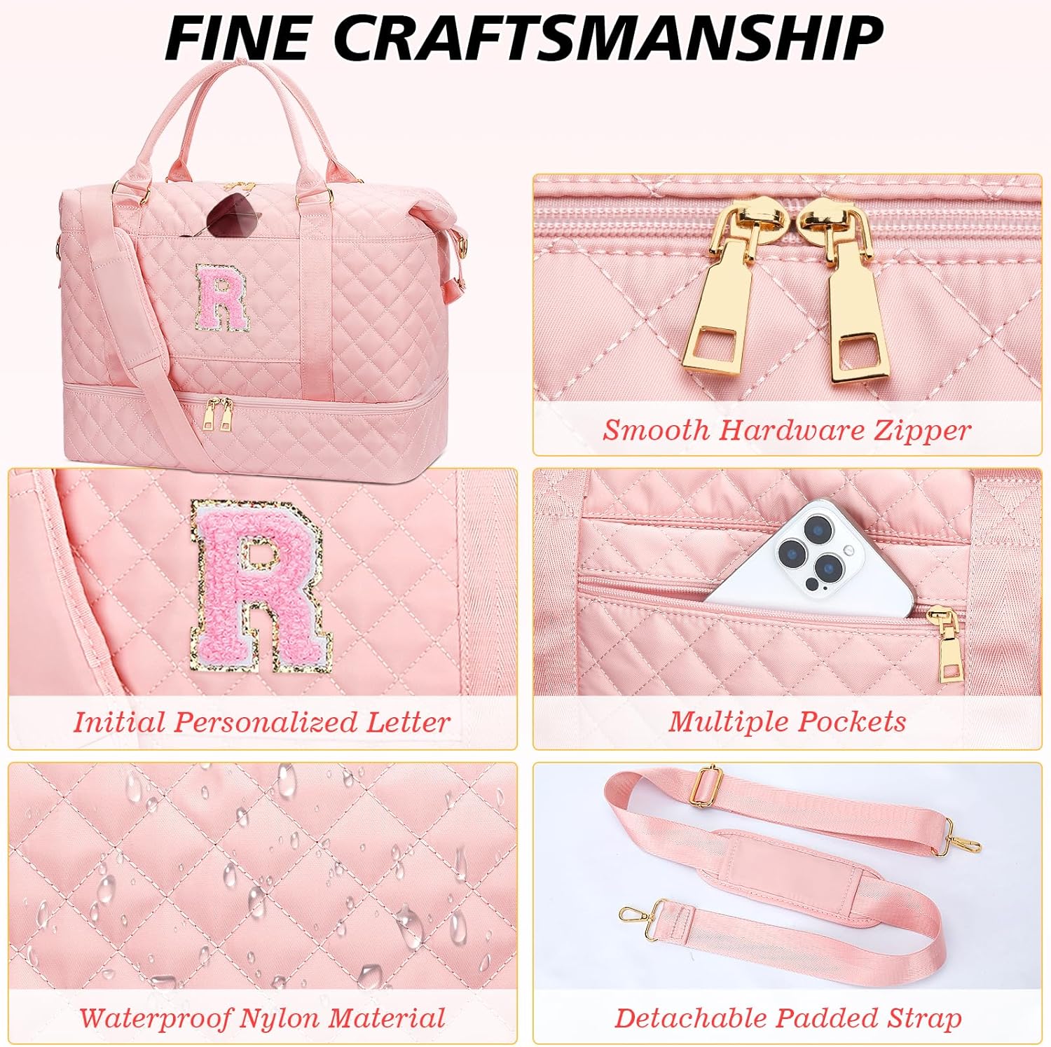 Gifts for Women Teen Girls Birthday Christmas Initial Travel Duffle Bag Quilted Weekender Bags Carry-On Overnight with Cosmetic Bag, Gym Bag with Shoe Compartment, Pink-R