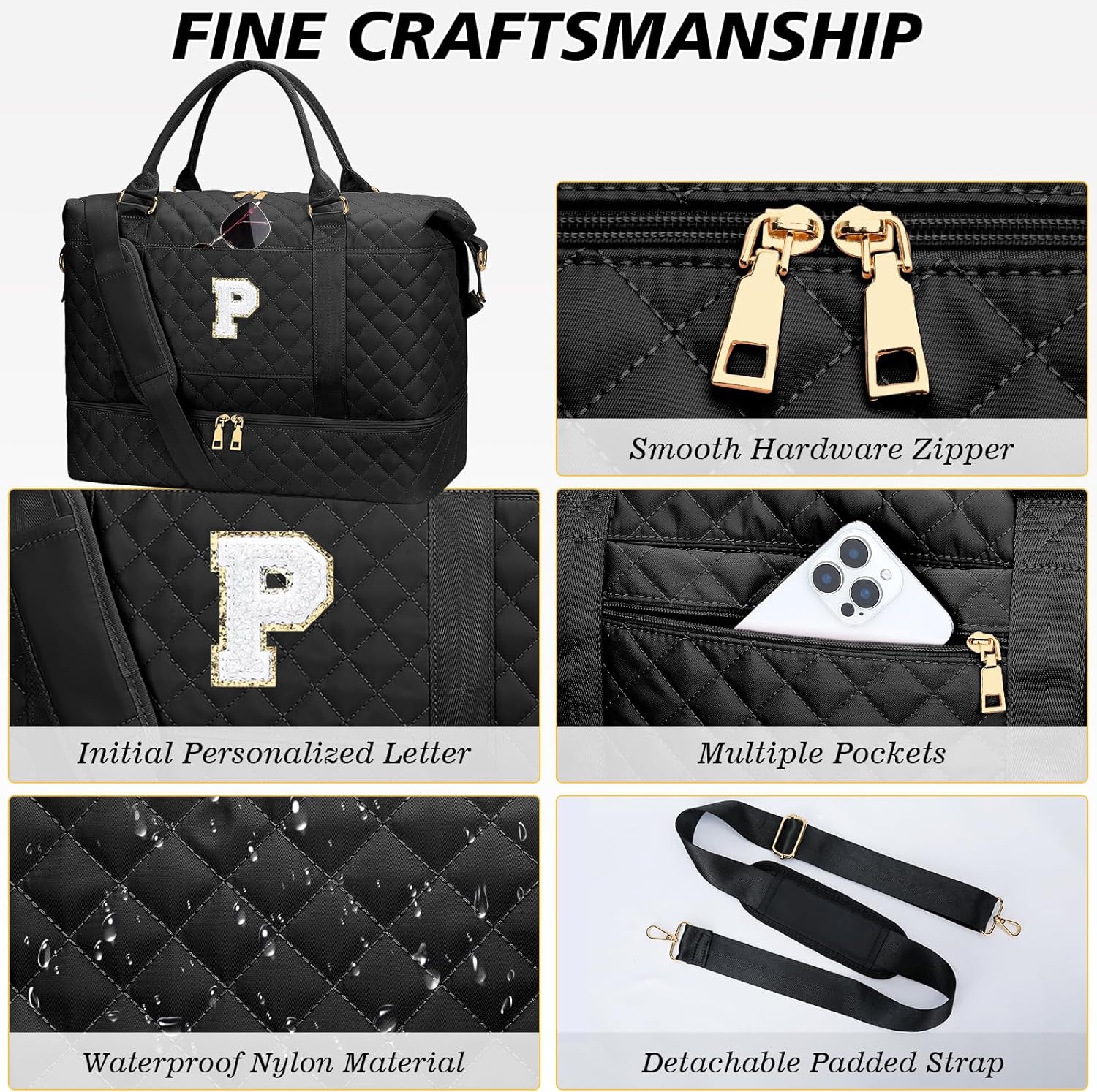 Gifts for Mom for Daughter Birthday Christmas Initial Travel Duffle Bag Quilted Weekender Bags Carry-On Overnight with Cosmetic Bag, Gym Bag with Shoe Compartment, Black P