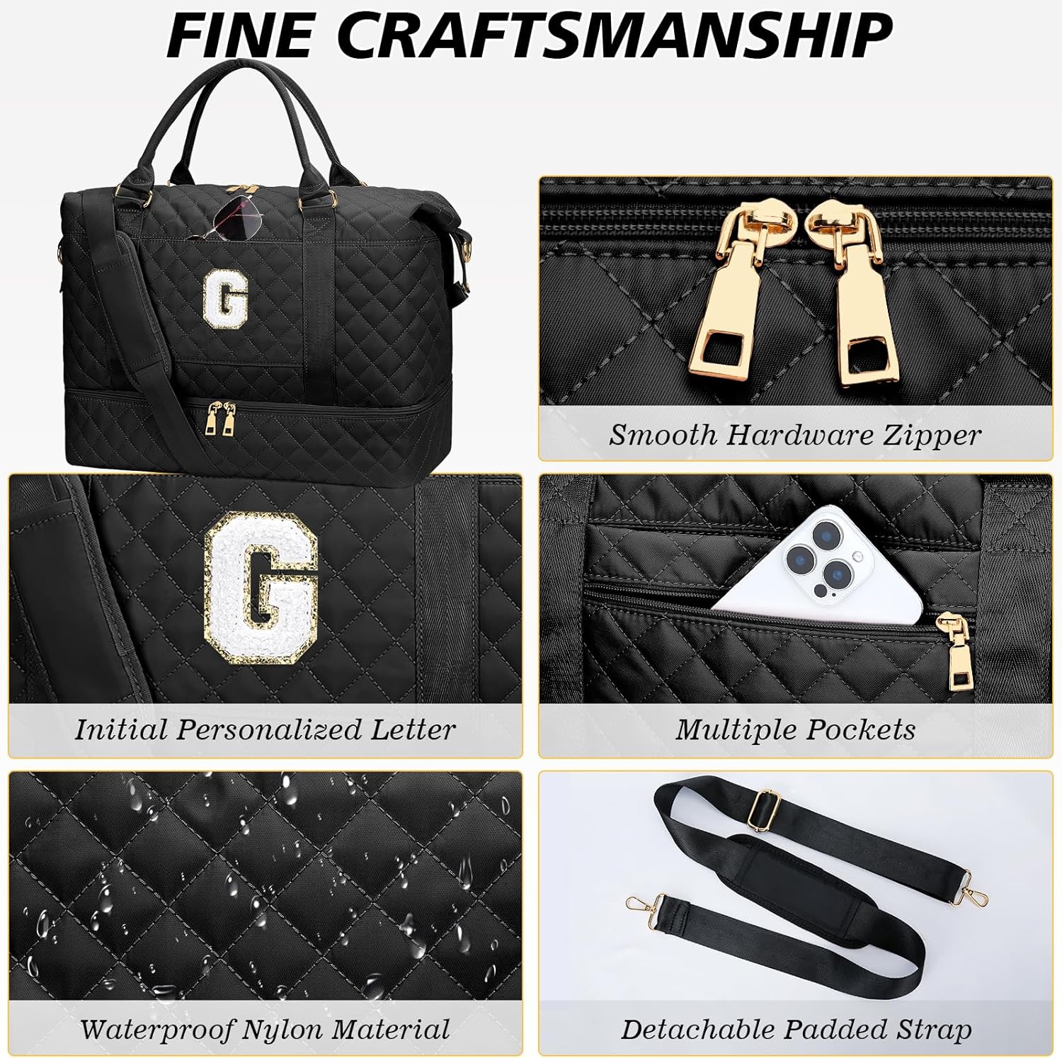 Gifts for Women Girls Birthday Christmas Initial Travel Duffle Bag Quilted Weekender Bags Carry-On Overnight with Cosmetic Bag, Gym Bag with Shoe Compartment, Black G