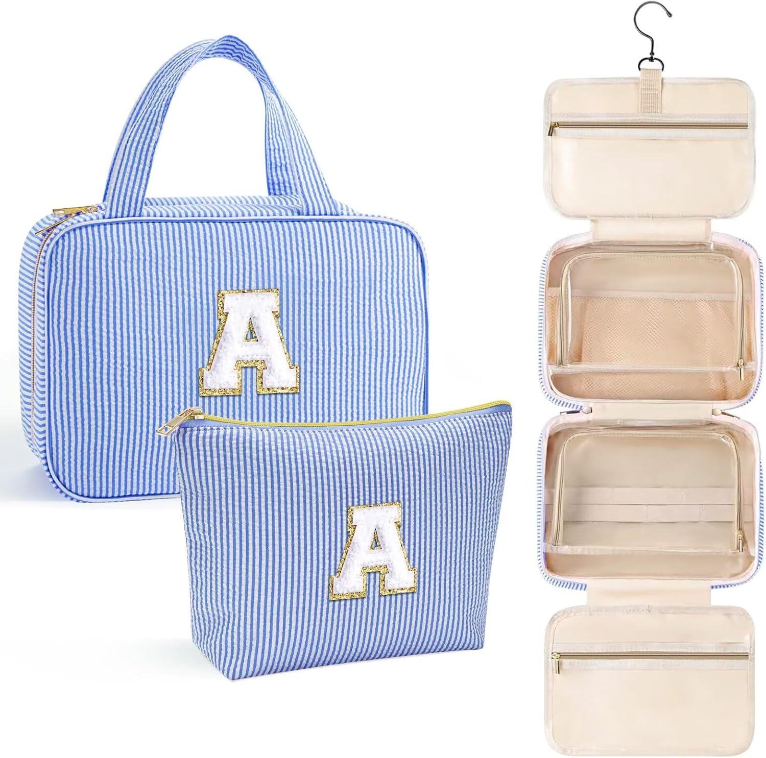 YOOLIFE Hanging Toiletry Bag Makeup Bag for Women Girls, Initial Toiletry Bag Cosmetic Bag, Personalized Birthday Gifts for Women Teen Girls, Letter A, Blue