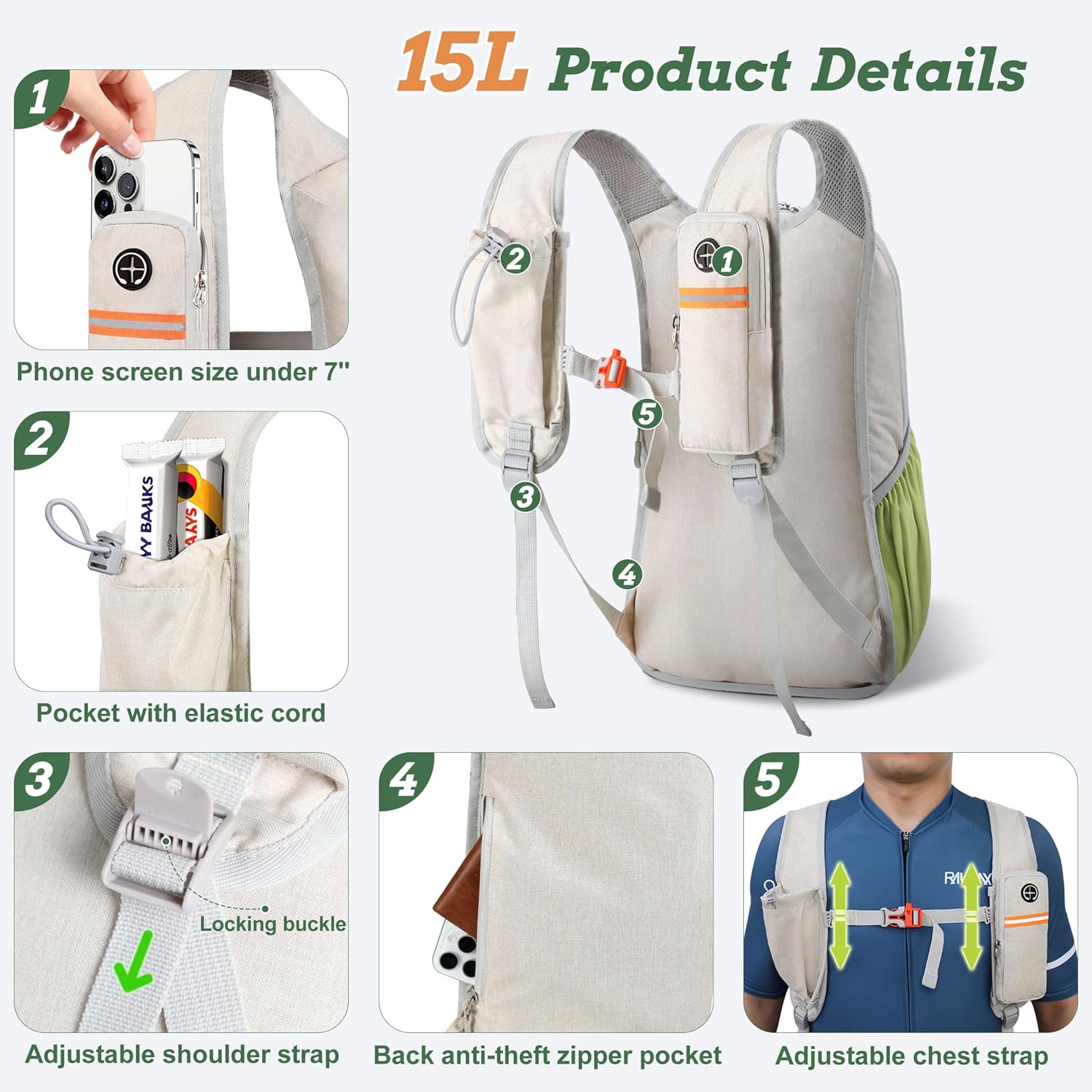 • Organized Multi-Pocket Design: With a capacity of 15L, this lightweight backpack for travel features several compartments, including a front elastic mesh pocket, a front zippered pocket, 2 water bottle holder, and a rear anti-theft zippered pocket, keeping your essentials organized and accessible.