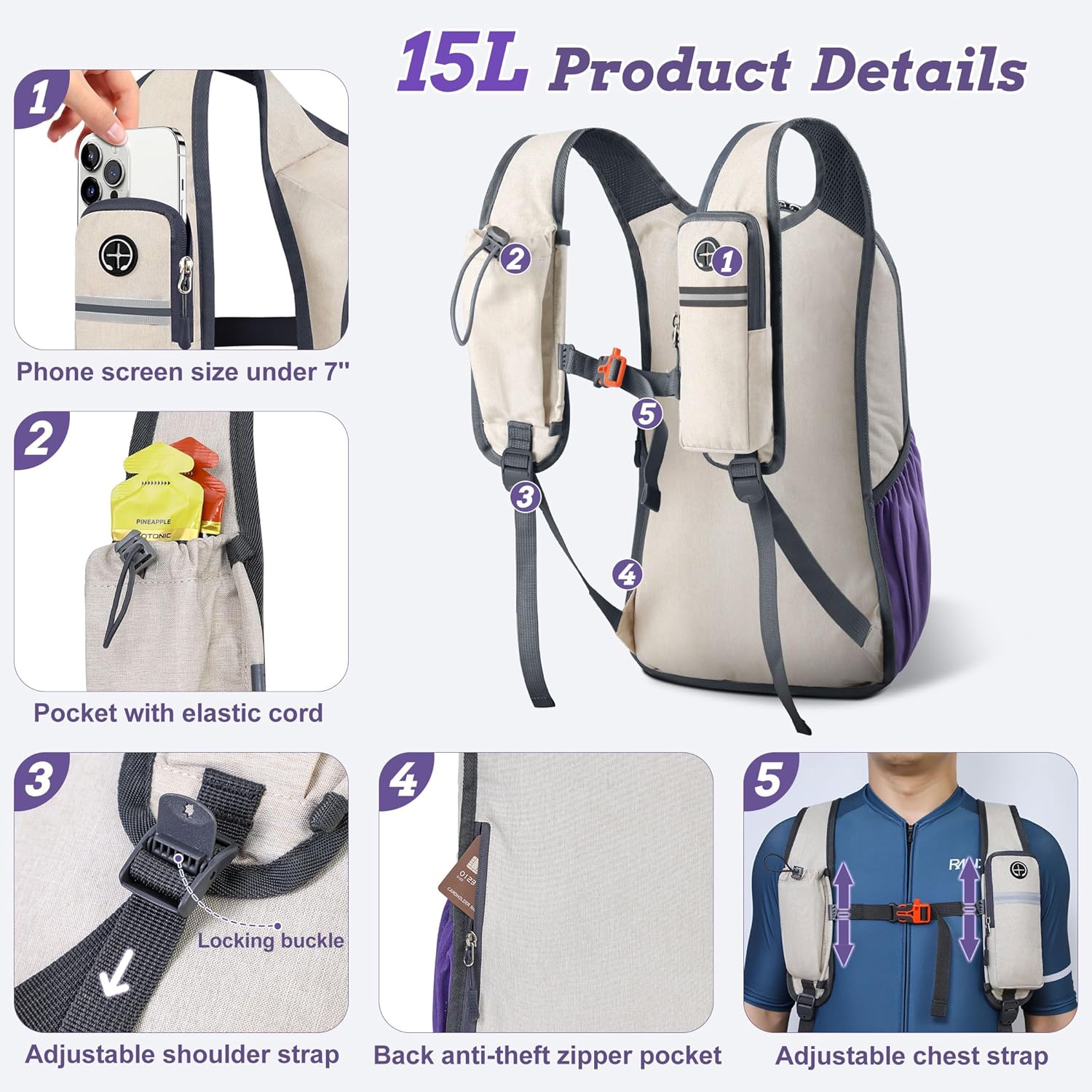 • Organized Multi-Pocket Design: With a capacity of 15L, this lightweight backpack for travel features several compartments, including a front elastic mesh pocket, a front zippered pocket, 2 water bottle holder, and a rear anti-theft zippered pocket, keeping your essentials organized and accessible.