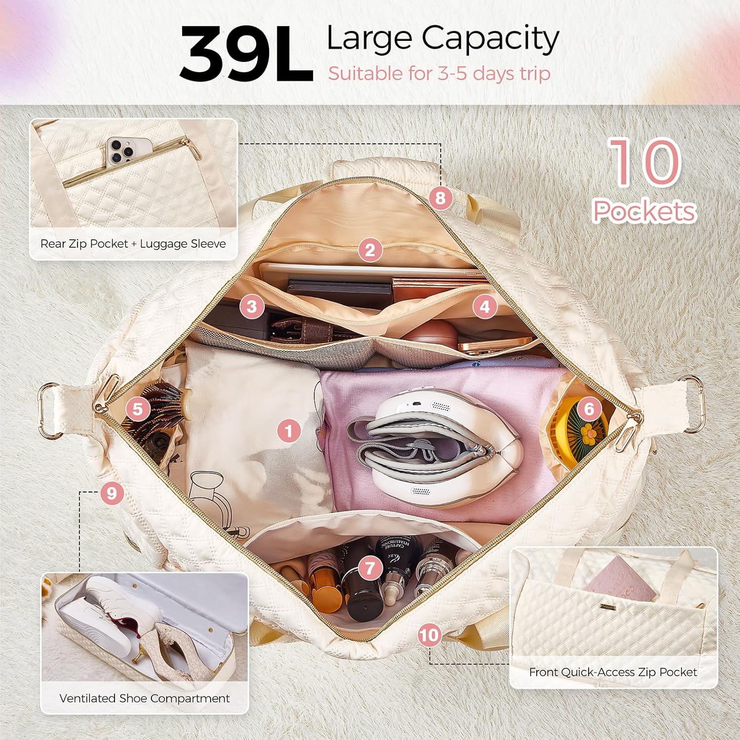 • 【Spacious 39L Capacity】This weekender bags for women is perfectly sized for 3-5 day trips. It features a cleverly organized interior with multiple pockets for efficient packing and even includes a separate cosmetic pouch, ideal for your toiletries or makeup
