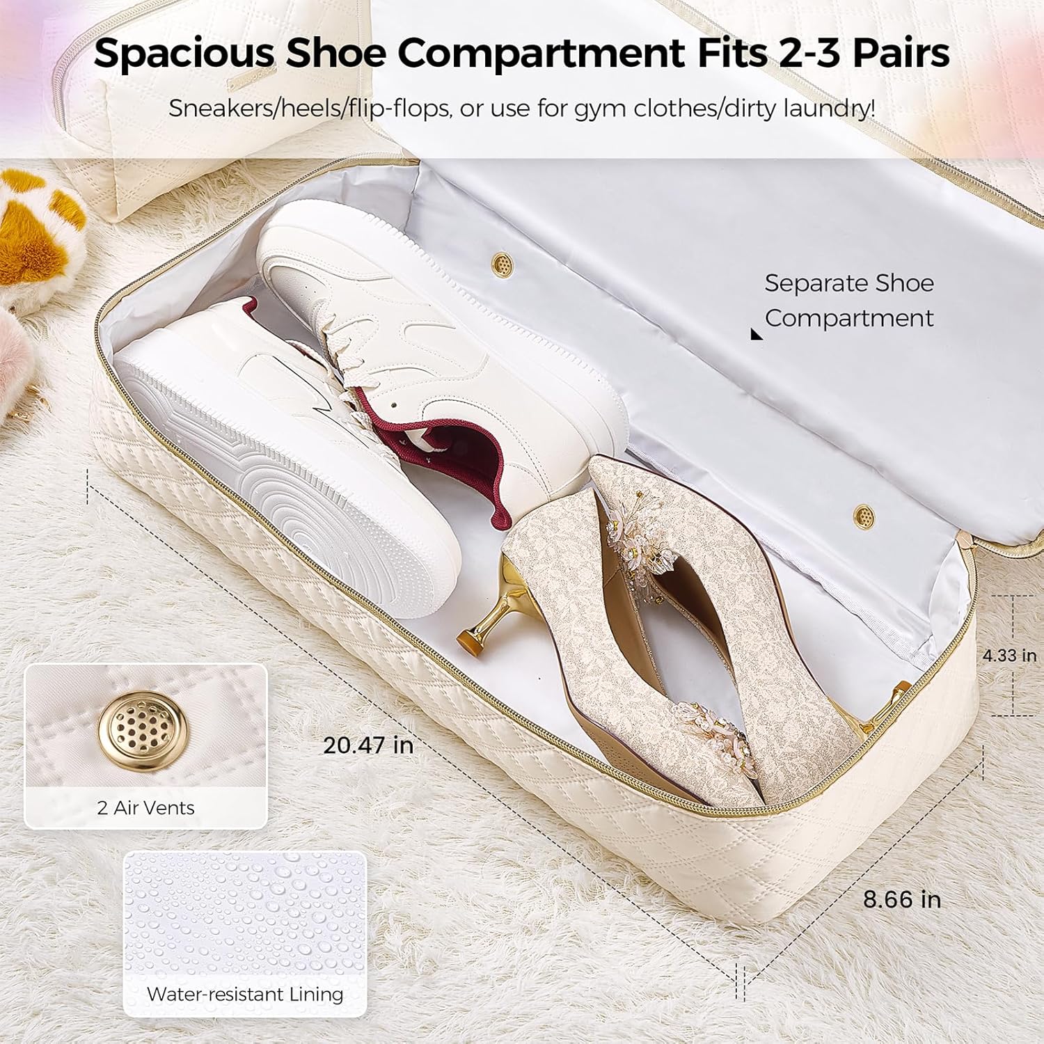 • 【Separate Shoe Compartment】This travel duffel bags for women features a dedicated shoe compartment, conveniently sized for 2-3 pairs of shoes (or your laundry). Designed with dual vent holes to prevent odors and maintain freshness, while your clean outfits perfectly protected