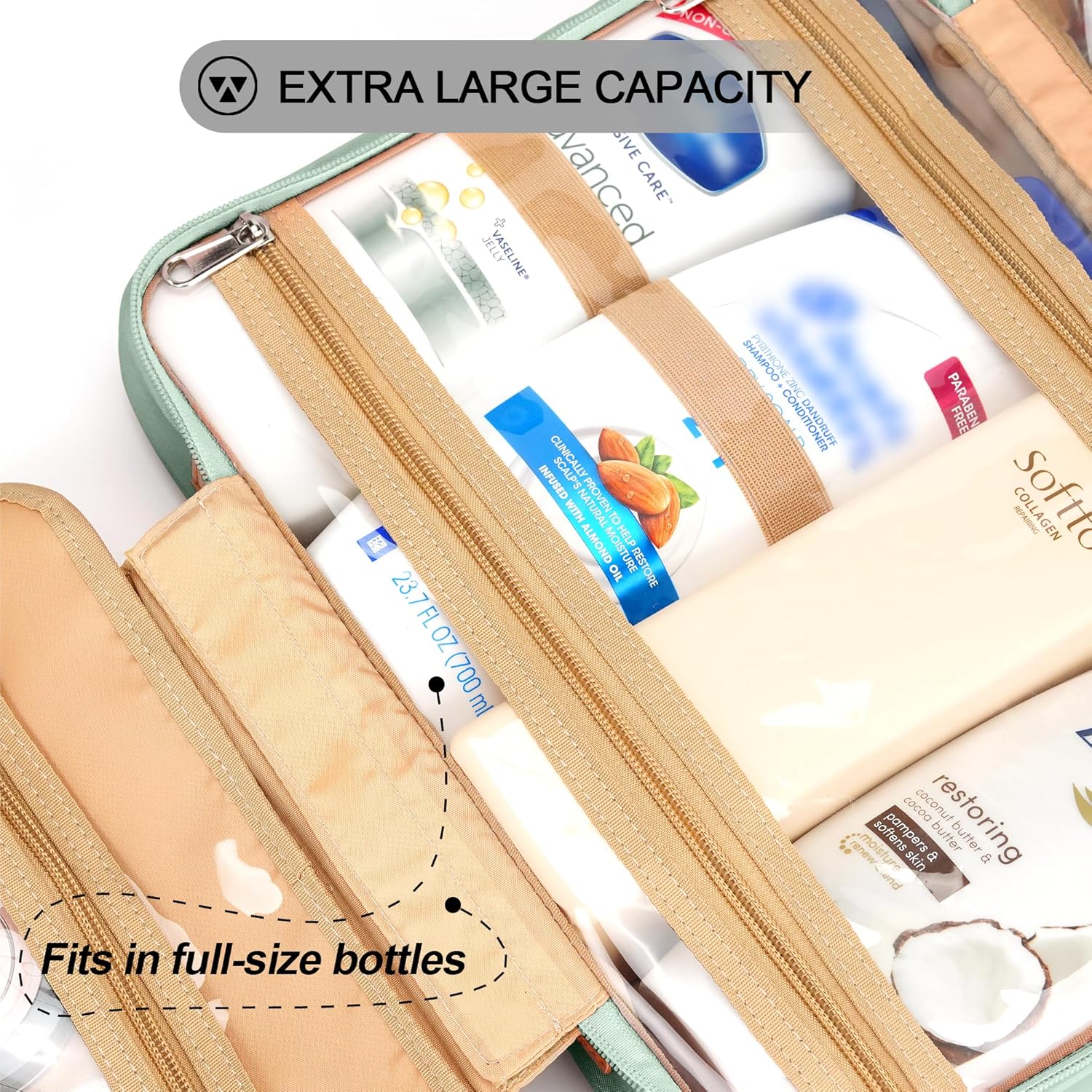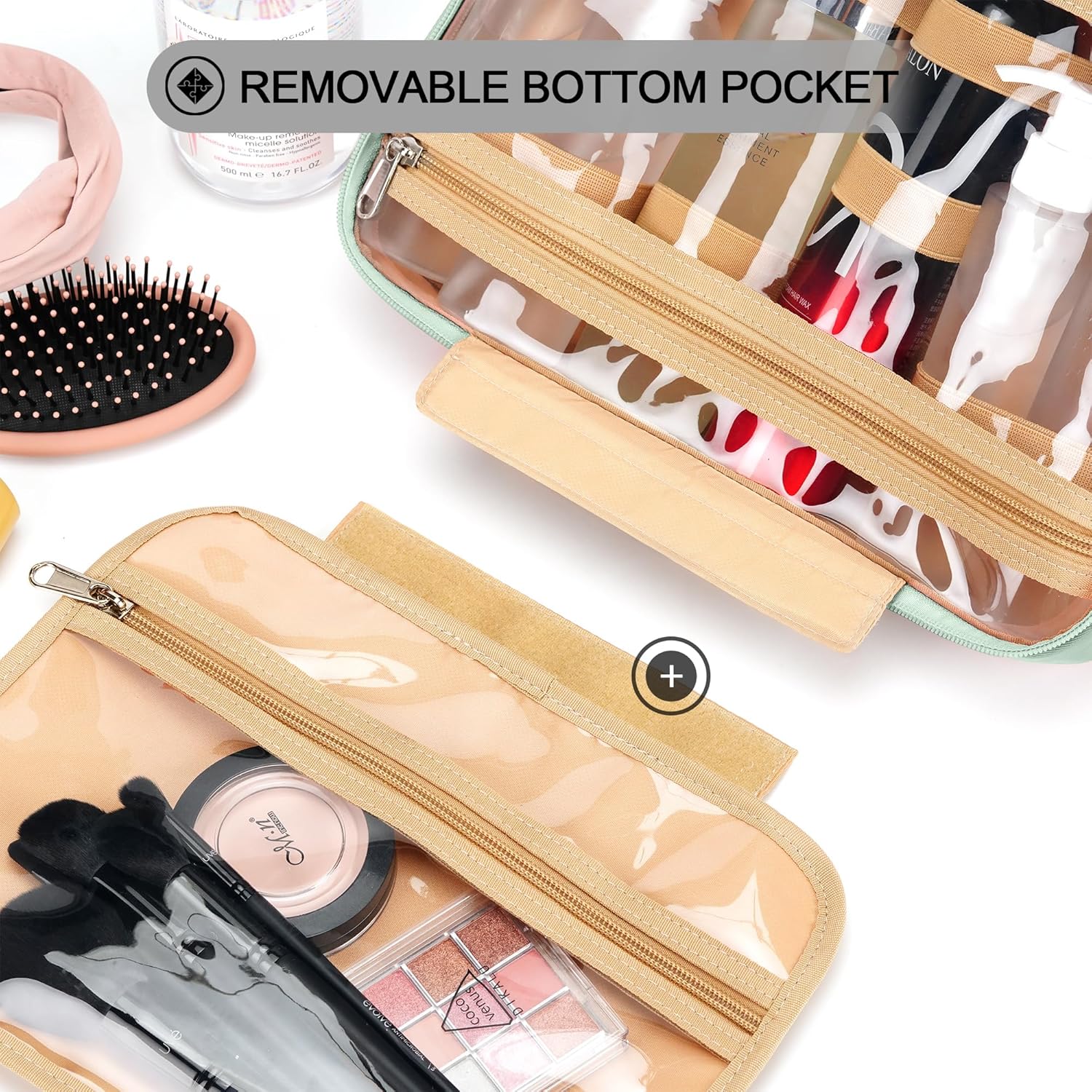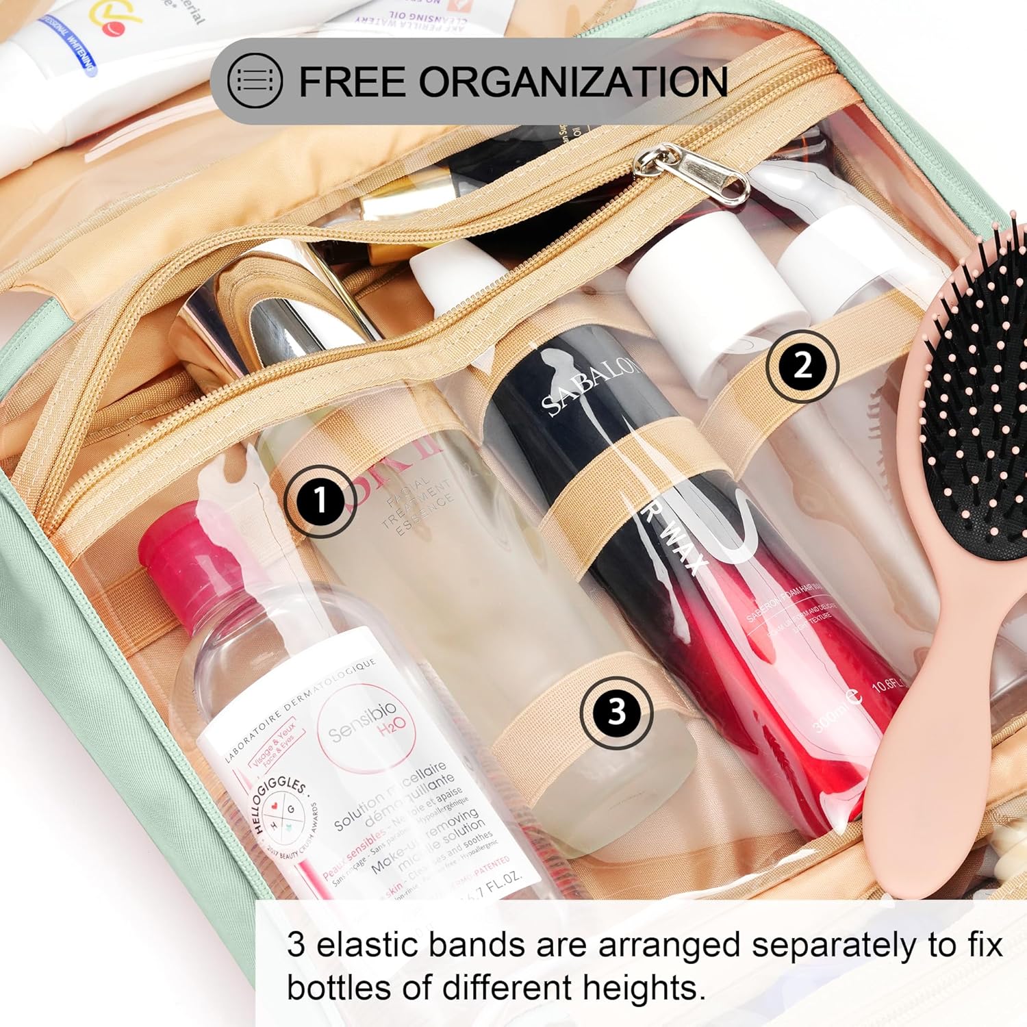 • CONSIDERABLE DESIGN - The elastic bands inside the two main compartments can keep the different height bottles fixed and upright. Your comb, toothbrush, razor, and leak-prone makeup can all go in there, even a hair dryer. 360° metal hook gives you a variety of hanging options.