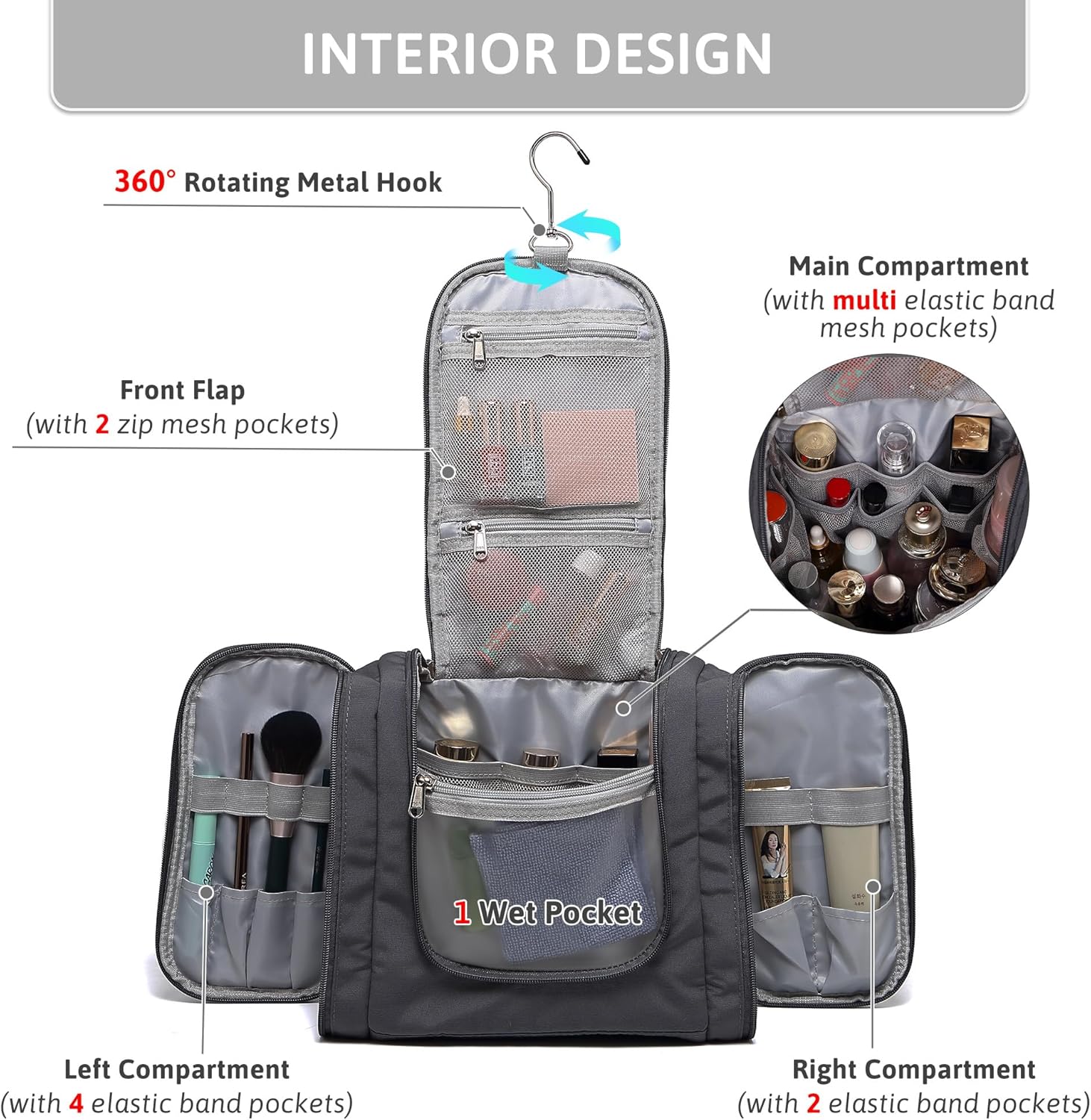 • 【VARIOUS COMPARTMENTS】- With 4 separate compartments for great organization. Front flap with 2 mesh pockets. Main and double side compartment with elastic bands to keep travel bottles upright. Can store toothbrushes, toothpaste, comb, makeup brushes and so on