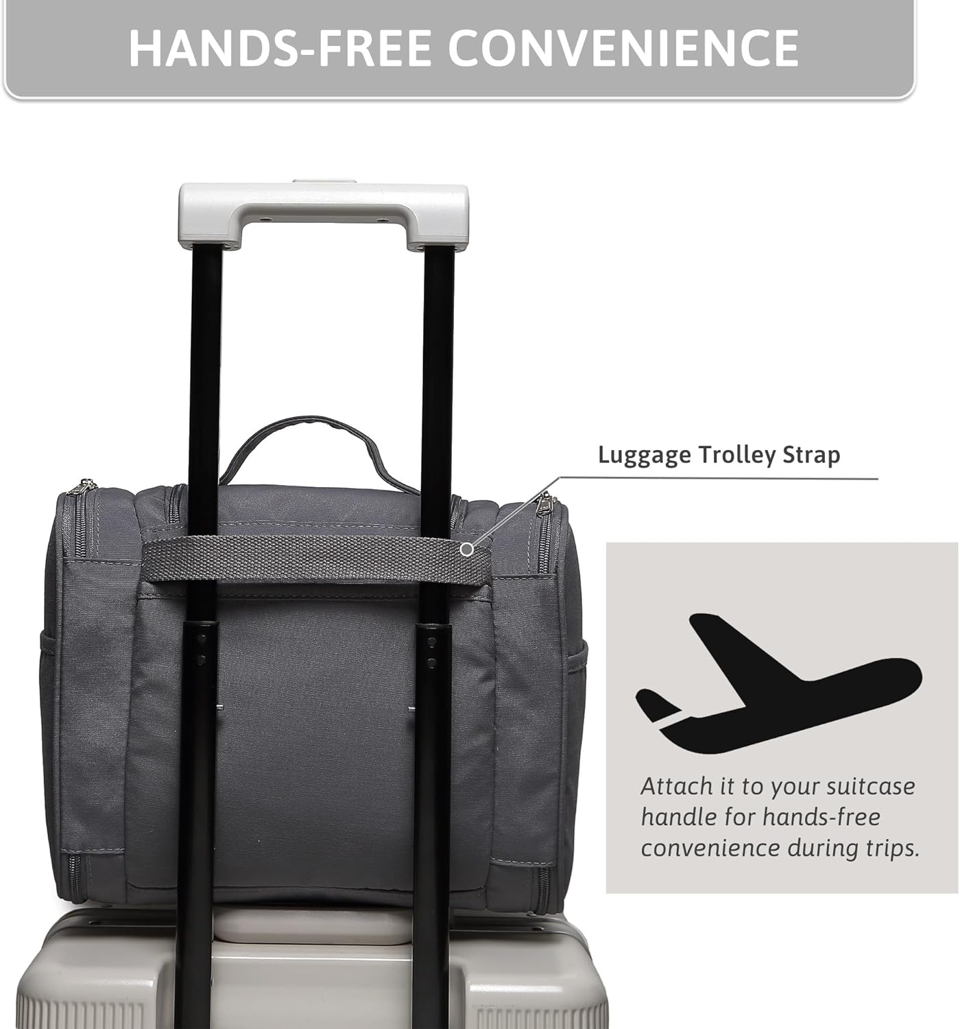 • 【CONVENIENT DESIGN】- Travel toiletry bag size: 12.0 x 5.51 x 10.04 inches. Top handle design makes this portable toiletry organizer easy to carry. The back trolley sleeve slides over rolling luggage handle, making airport travel a breeze