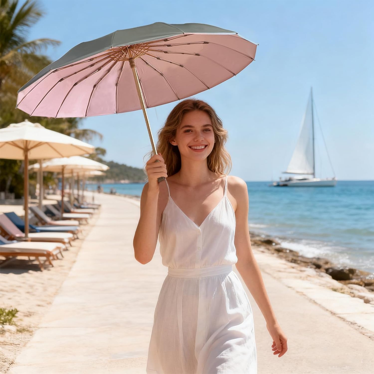 • 【High-quality portable umbrella】 Strong umbrella made of good materials, 16 ribs aluminium alloy sturdy umbrella frame (lightweight but can withstand strong winds), high-density umbrella fabric (Sunlight cannot penetrate the umbrella, cooling ,uv protection), Umbrella fabric with Japanese titanium-silver coating technology(Technological, stylish ), Wooden handle (comfortable in your hand)