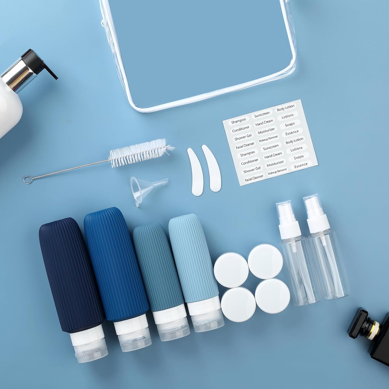 • Useful Travel Accessories: This is a oversize assortment of travel containers in a useful zip case. ( Come in 2 pcs Larege 6oz & 2pcs 3oz Travel Bottles + 4 Travel Jar s+ 2 Spray Bottles + 2 Scoopers + 1 Funnel + 1 Clean Brush + 1 Page Label + 1 Clear Toiletry Bag ) Multiple ones allow you take along different beauty products and toiletries according to your requirement