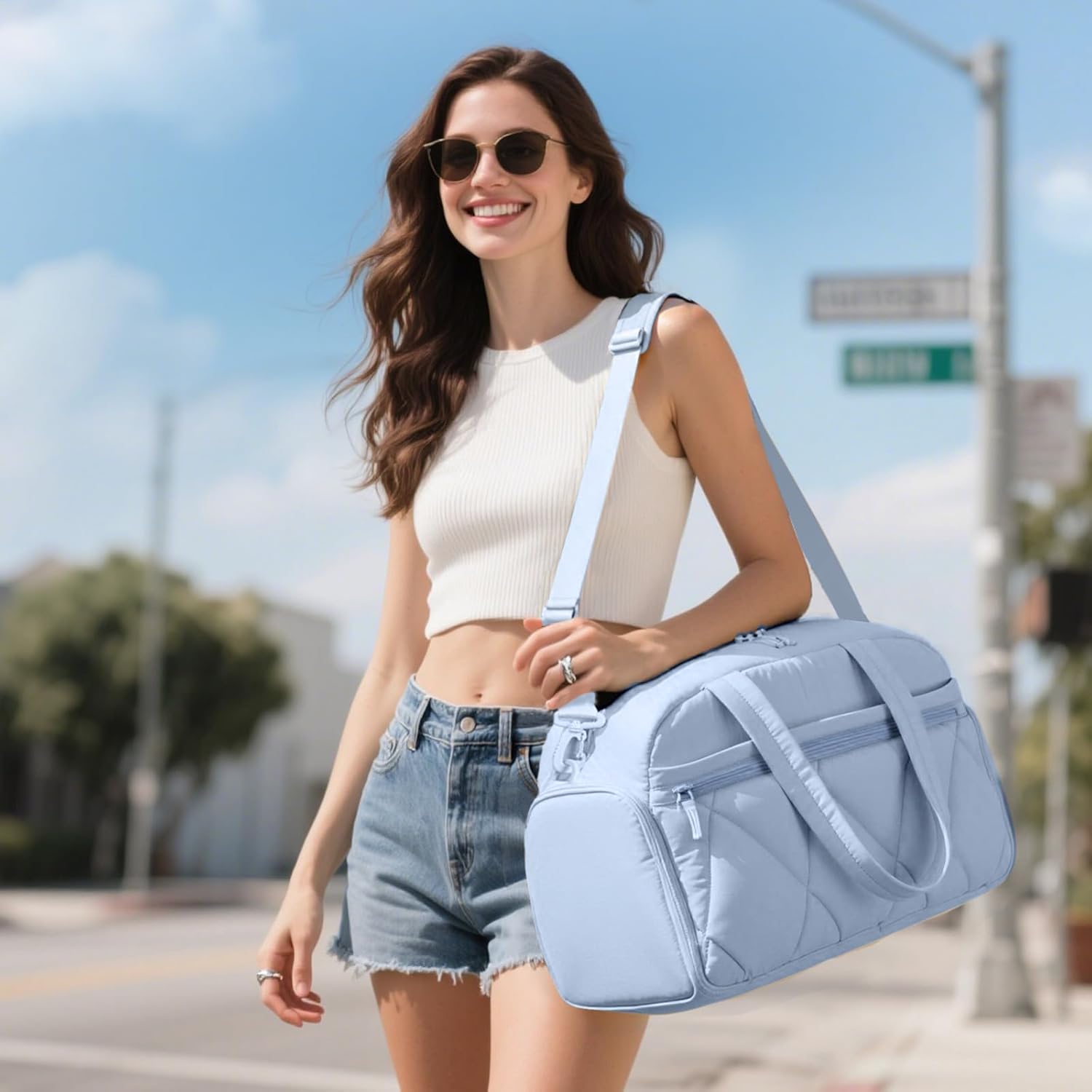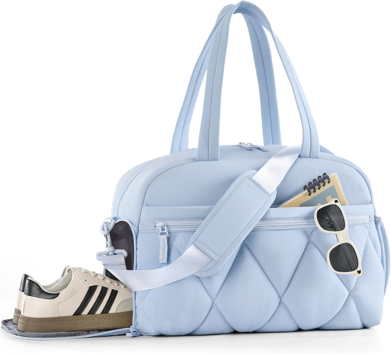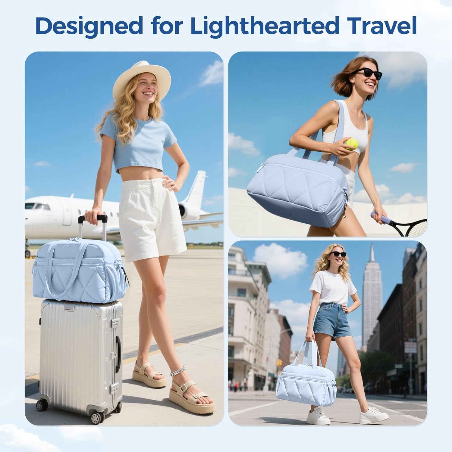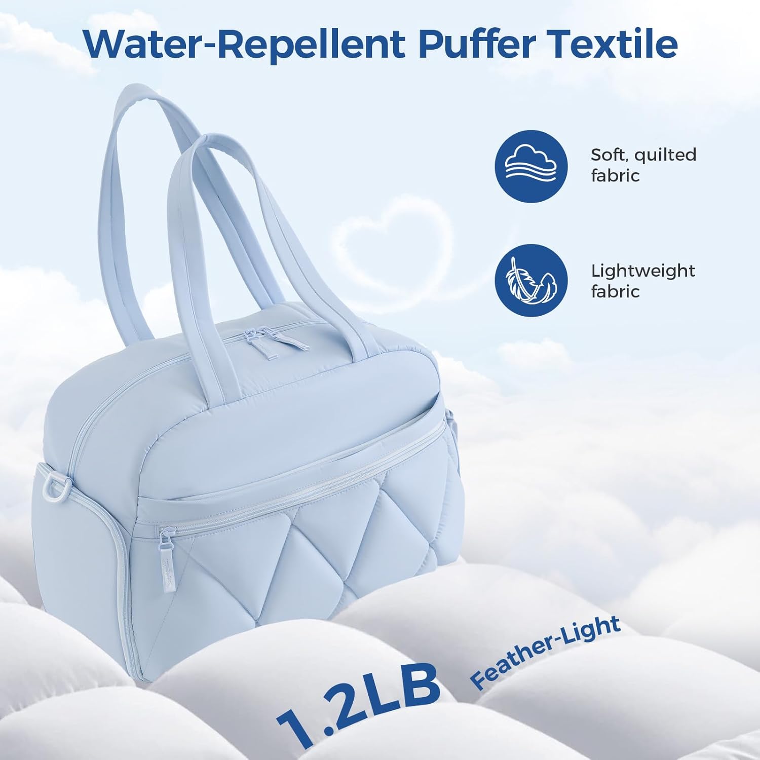 • [Premium Lightweight Puffer Material]-Crafted from high-quality puffer taslon material, This travel duffel bag combines a modern aesthetic with practical functionality. Its soft, quilted texture is not only stylish but also lightweight and durable, making it the ideal choice for women who value both elegance and convenience!