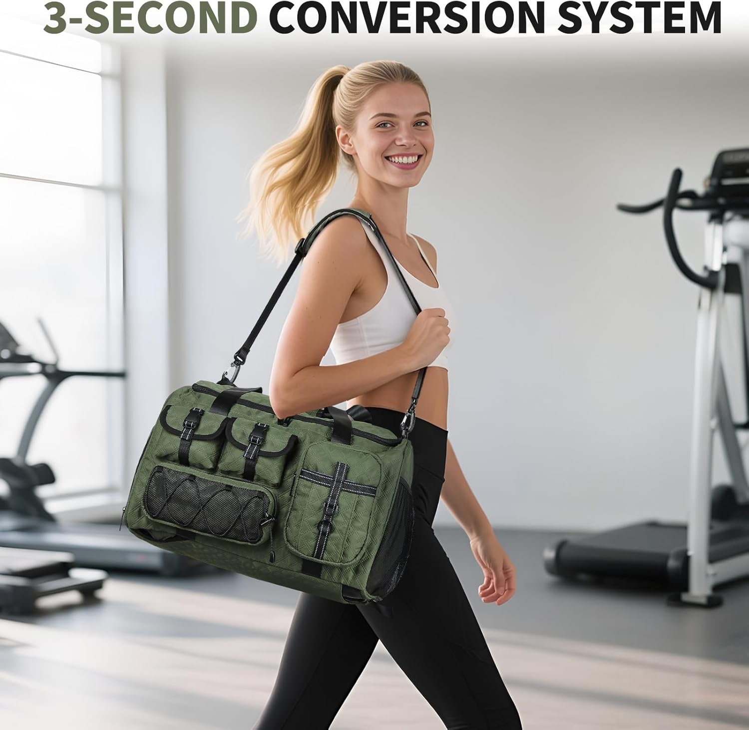 • Multi-Carry Design -- This versatile gym bag (20x11.8x12.6 inches) easily converts to a sport duffel bag or backpack or gym tote, and features a dedicated breathable shoe compartment to separate shoes from clean gear.