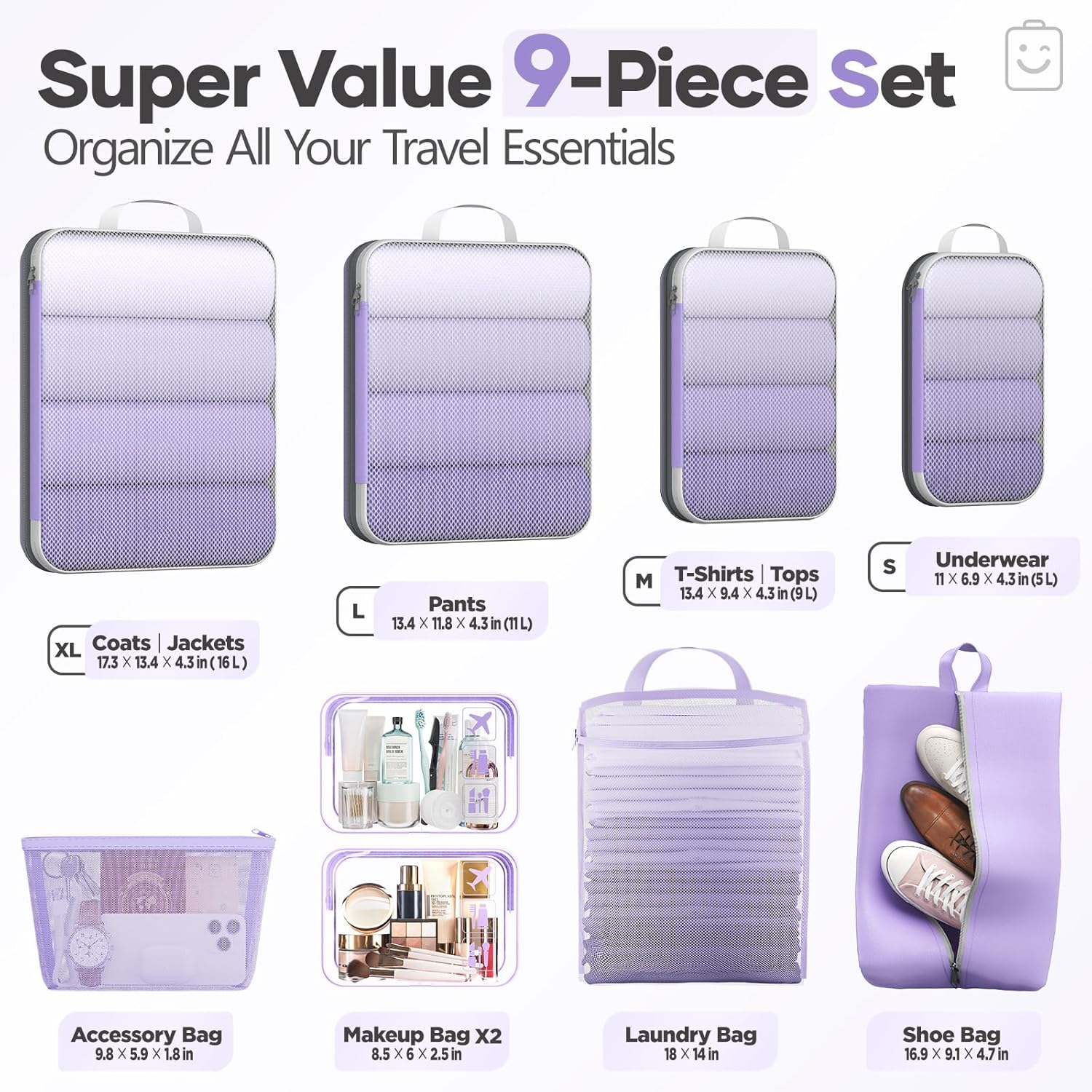 Veken 9/11 Set Compression Packing Cubes for Travel Essentials,Compressible Expandable Large Luggage Suitcase Organizer Bags for Clothing,Durable Space Saver Storage Bags(Light Purple)