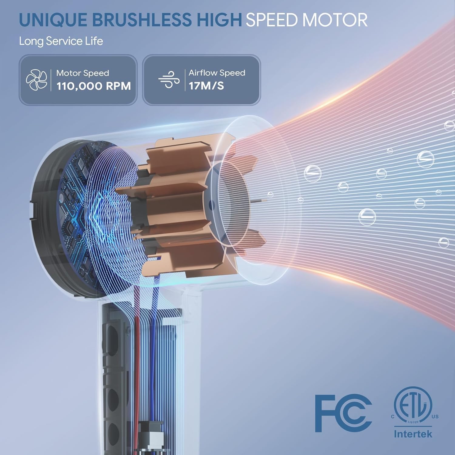 • High-Speed Motor for Fast Drying: Equipped with a powerful 110,000 RPM brushless motor and an enhanced duct design, the Labiim professional hair dryer delivers swift airflow at 17m/s—five times faster than traditional hairdryers.