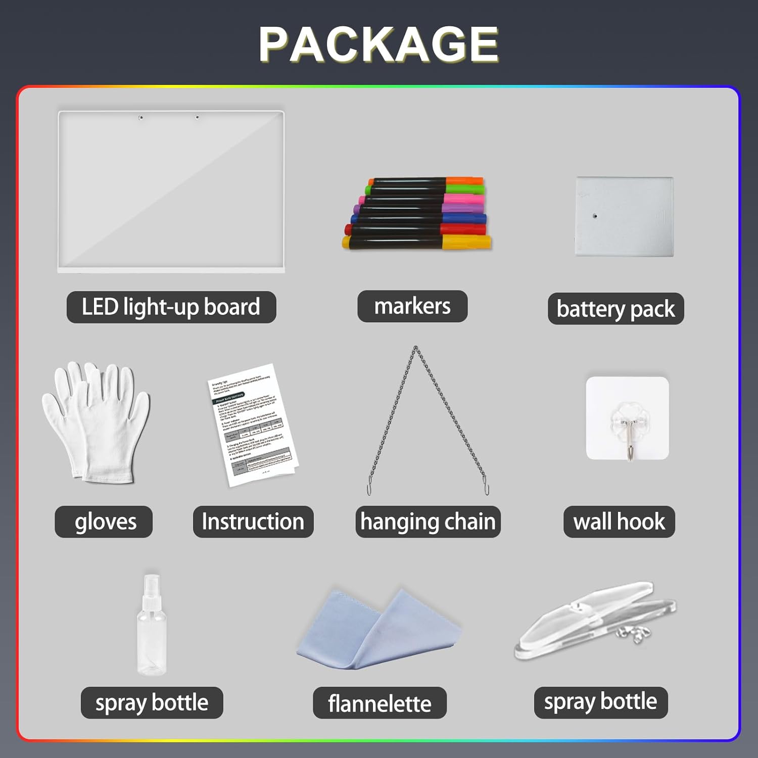 • Super complete accessories: Our LED drawing board comes with 1 acrylic drawing board, 1 spray bottle, 1 cleaning cloth, 2 hanging hooks, 1 chain, 1 battery box that requires 4 AA batteries, 2 invisible brackets, 1 nano bar, and 1 pen holder