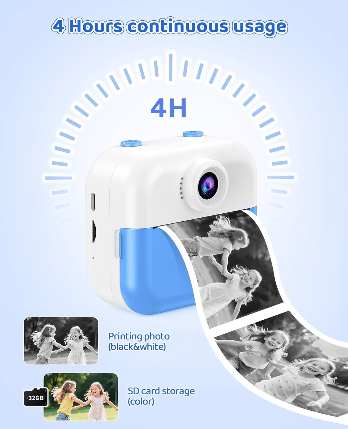 • Instant Print Camera for Kids:This creative camera prints black & white photos in just 1 second while saving color versions to the included 32GB memory card. Children can personalize their shots with 15 fun filters and 16 cute stickers. The thermal printing technology requires no messy ink - simply load the included paper rolls (372 sheets included!) for endless creative play.