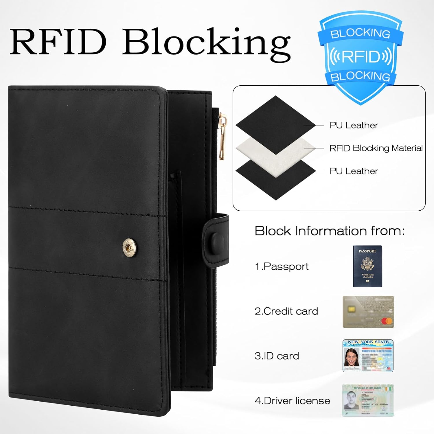 • RFID Blocking Passport Holder: The embedded RFID-shielding layer blocks 13.56MHz electromagnetic signals, creating an impenetrable barrier against wireless identity theft