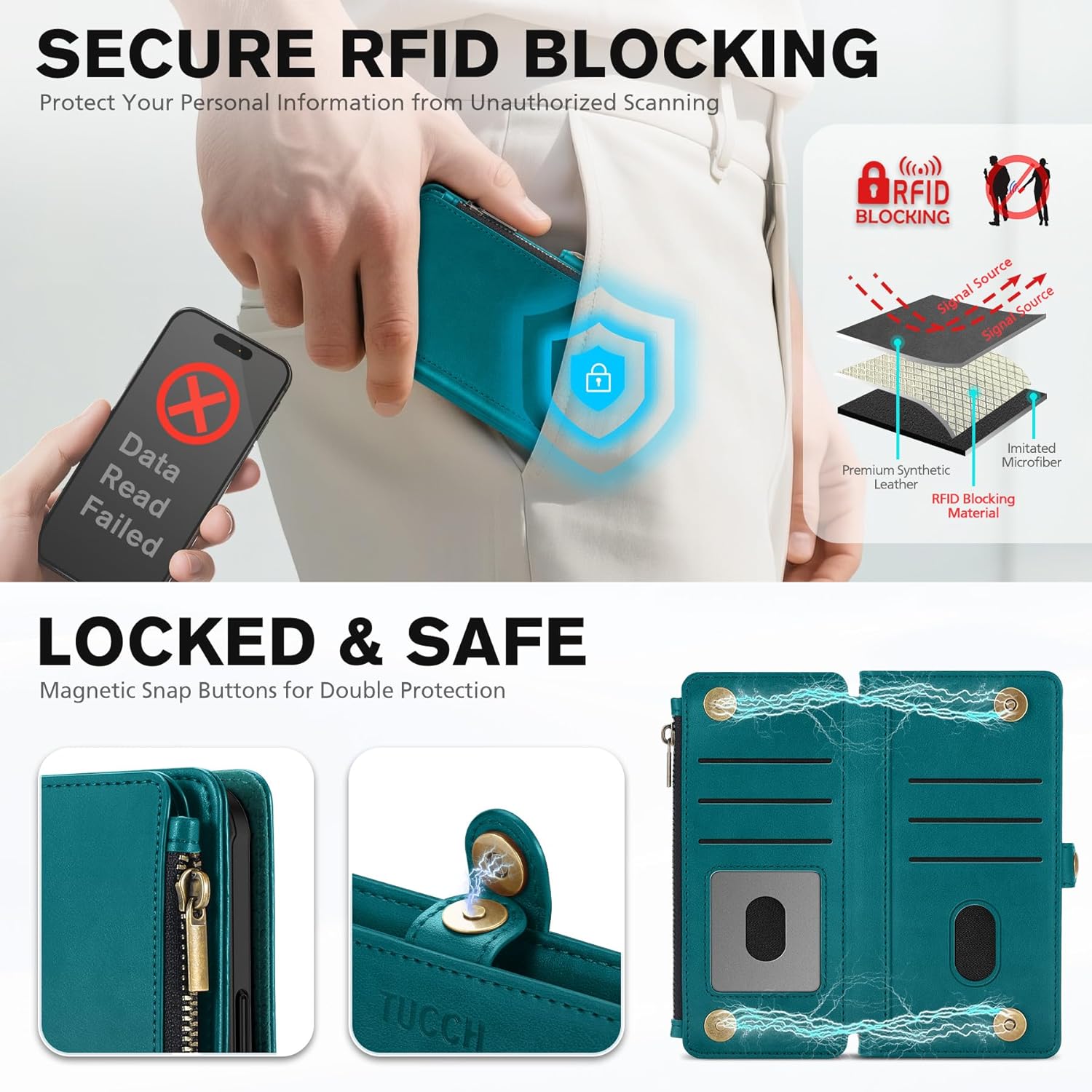 • RFID Blocking Zipped Purse + Card Holders: This folio magnetic wallet has 1 zipper purse, 1 cash pocket, and 9 individual card slots (including a clear ID window and 2 convenient quick access cutouts), for easy access to your daily essential cards. RFID blocking technology to block signals effectively and protect your card information from unauthorized scans