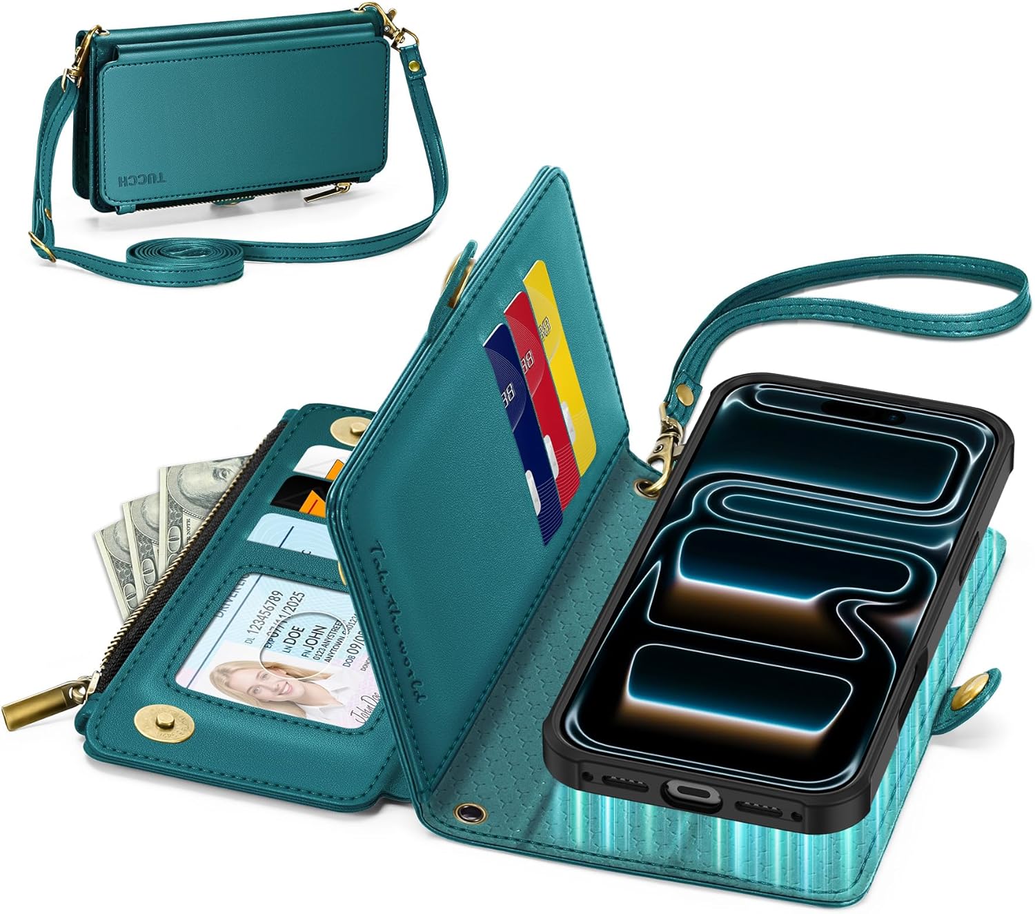 TUCCH Detachable Crossbody Wallet Case for iPhone 17 Pro (6.3"), 9 Card Holders RFID Blocking | Lanyard | Wrist Strap | Wireless Charging | Zipper Pocket | PU Leather | Stand Flip Cover | Bluish Green